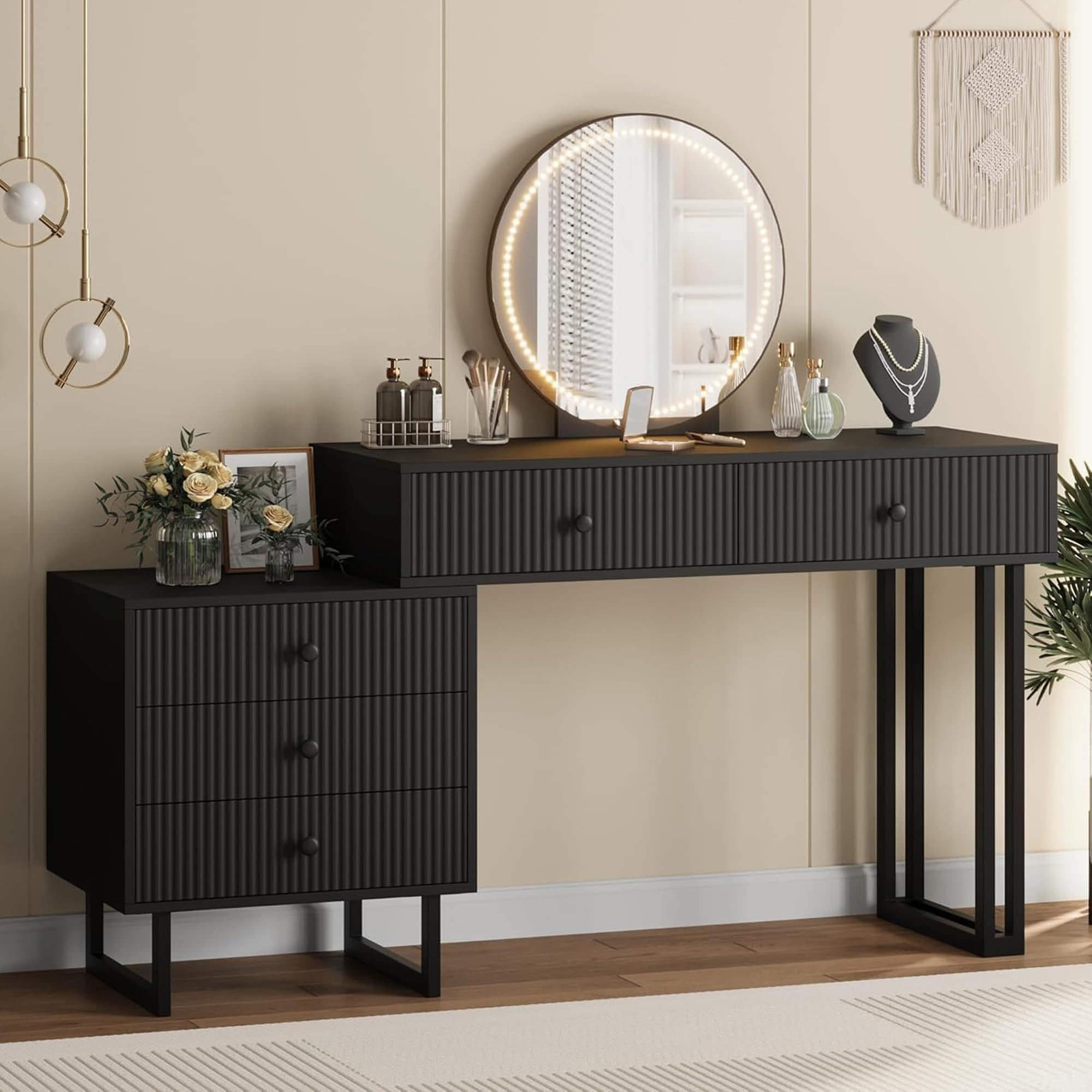Vanity Desk with Mirror & LED Lights, Makeup Table with 3 Color Modes, 5 Drawers, Modern Bedroom Dressing Table