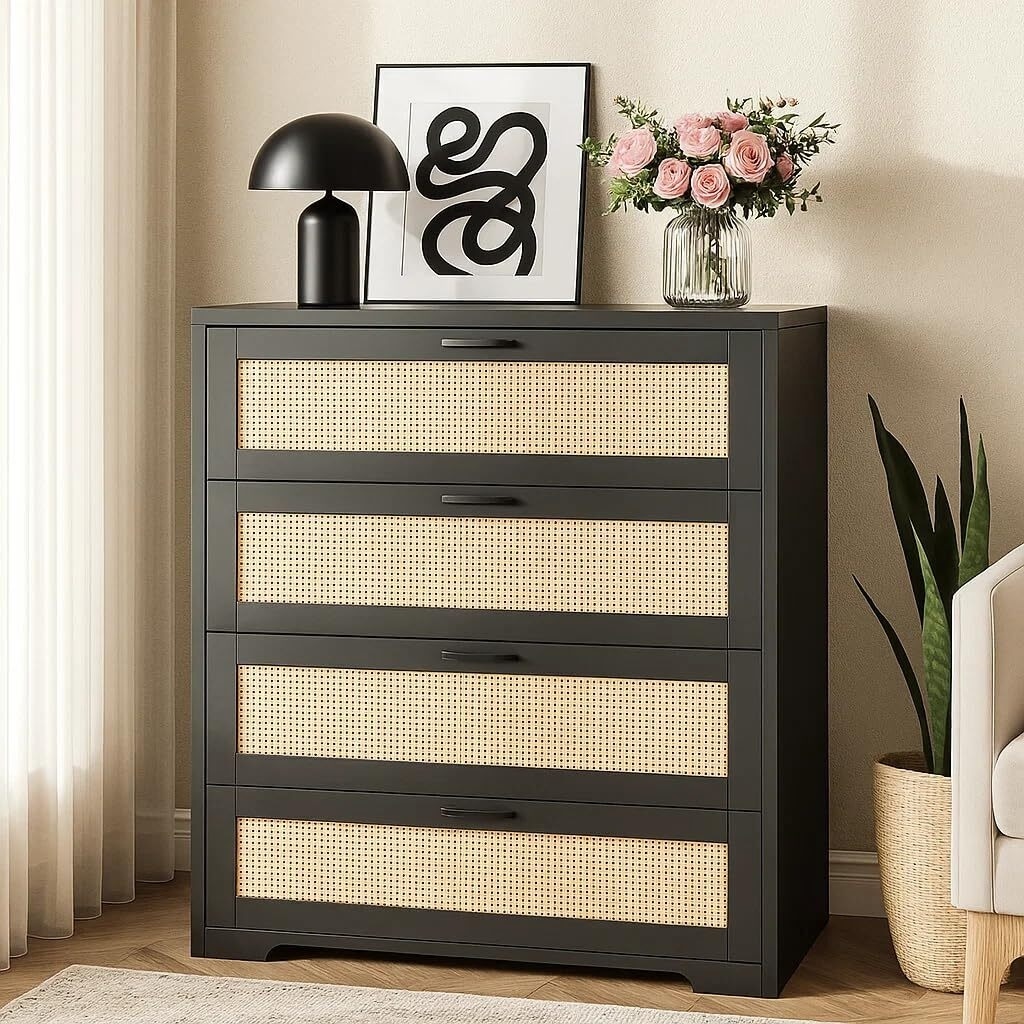 Tall 4 Drawers Rattan Dresser, Storage Chest of Drawers with Wooden Spacious Top,Handles,Easy to Assemble