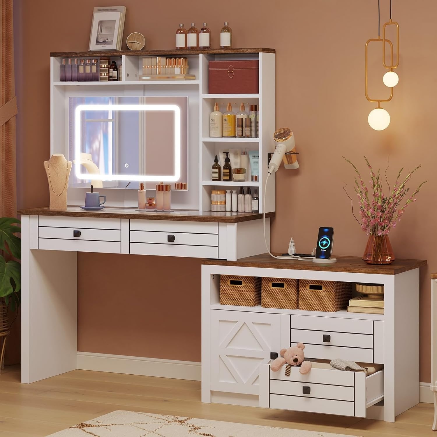 Dressing Table with LED-lit Mirror & Hidden Storage,Includes Padded Stool,Adjustable Brightness Vanity Desk