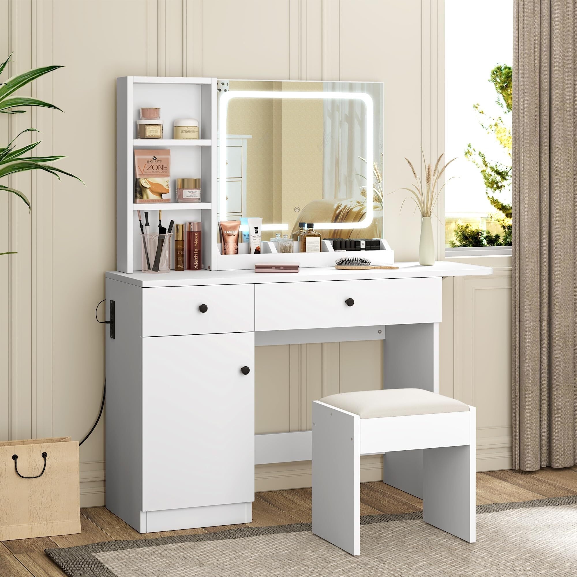 White MDF Dressing Table with 3-Color LED Vanity Mirror and Stool