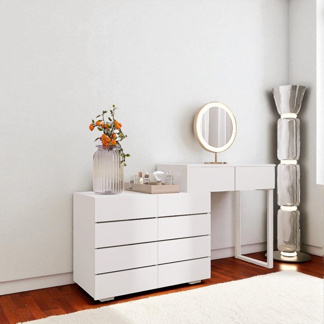 9-Drawer White Dresser and LED Mirror Set with Elegant Modern Finish, Smooth Glide Drawers, and Ample Storage