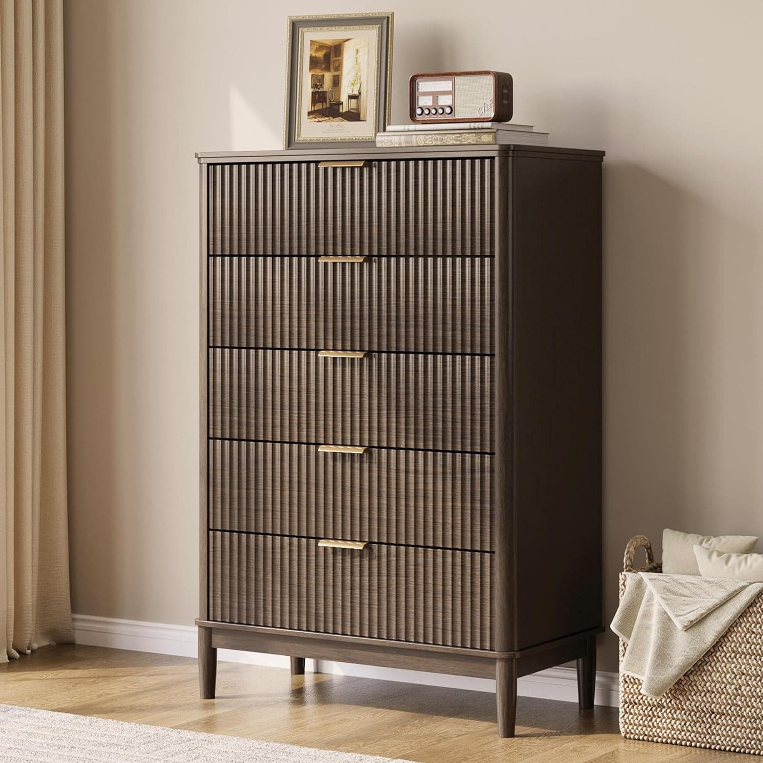 Mid-Century Modern 5-Drawer Walnut Dresser, Curved Profile Design, 46 Inch Tall, Ample Storage for Bedroom or Living Room
