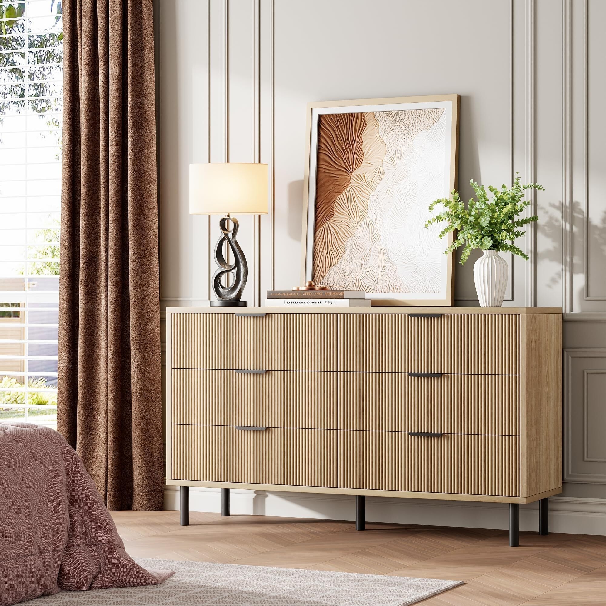 Fluted 6 Drawer Dresser, Wide Wood Double Dresser with Metal Legs and Handles, Modern Chest of Drawers with Anti-Tipping