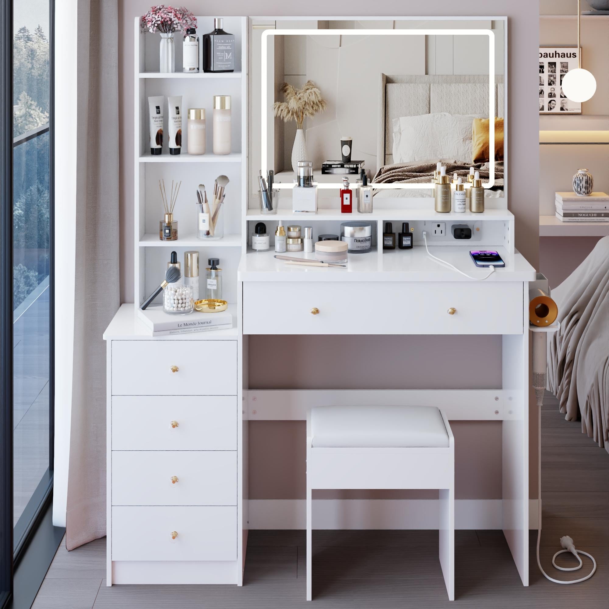 41" Large Size Left Bedside Cabinet Vanity Table+Cushioned Stool Dresser Set, 2 AC+2 USB Power Station