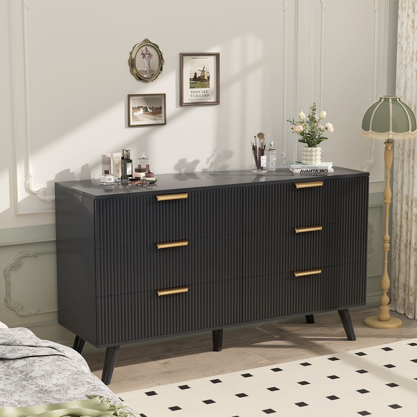Gymojoy Fluted 6 Drawer Dresser with Gold Metal Handles, Modern Chest of Drawers for Living Room, Bedroom, Apartment