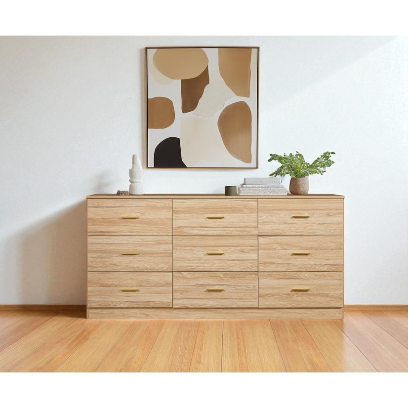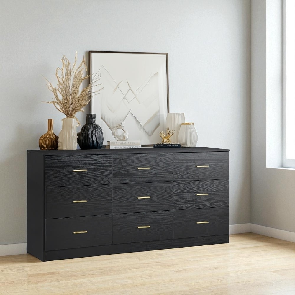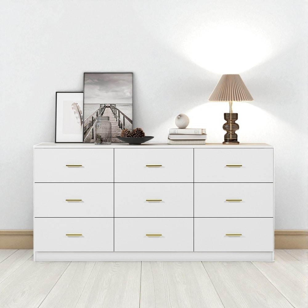 9 Drawer Dresser for Bedroom with Golden Handles, Wide Chest of Drawers for Clothes Storage, Sturdy Engineered Wood Cabinet.