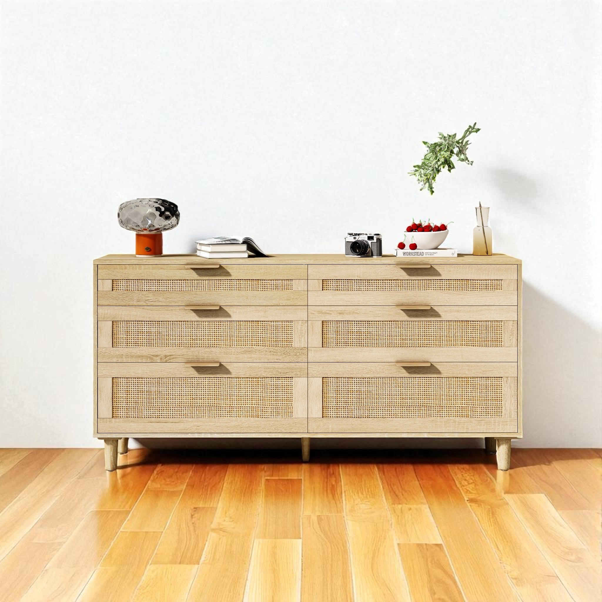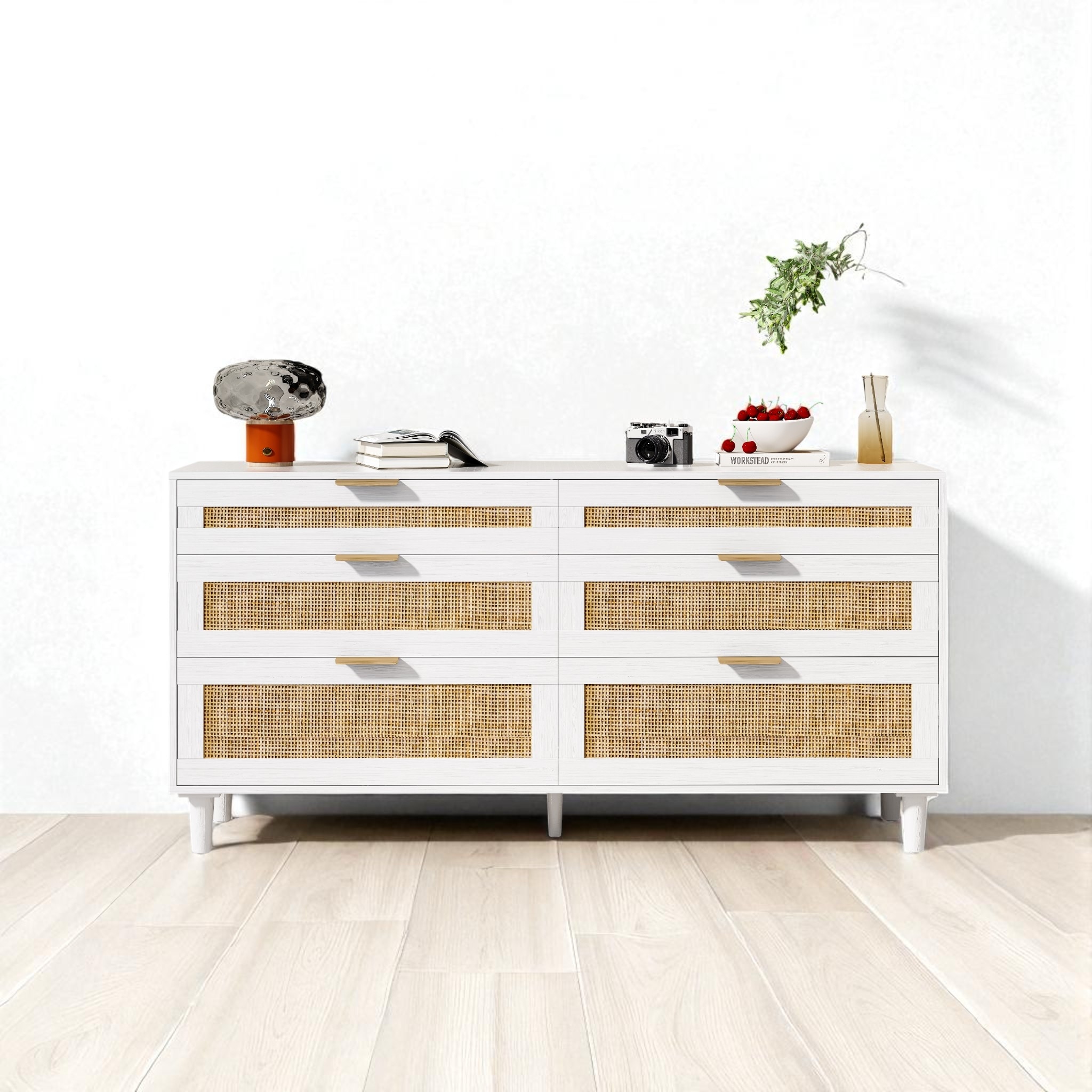 Modern 6 Drawer Rattan Dresser with Metal Handles and Wood Legs, Clothes Storage Cabinet for Bedroom, Living Room, or Hallway.