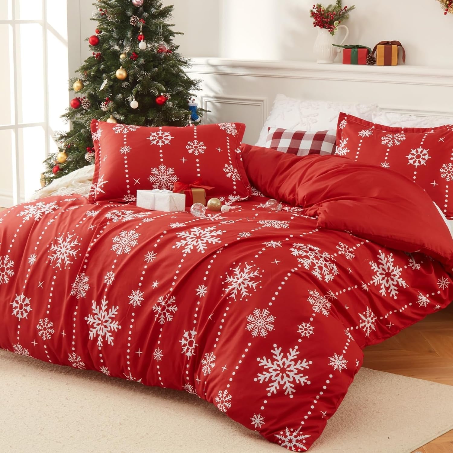 3 Piece Christmas Duvet Cover Snowflake Decorative Bedding Soft Microfiber Red Duvet and 2 Pillow Shams