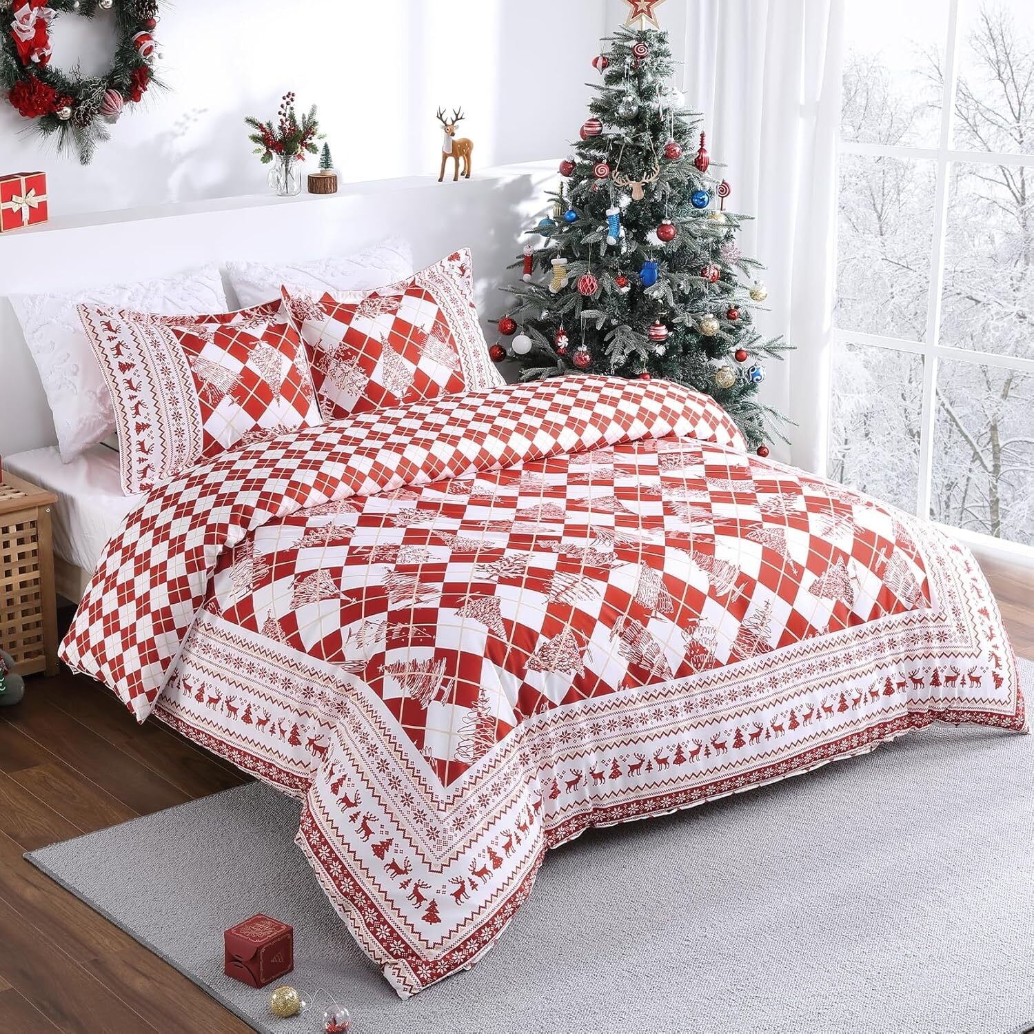 Red Checkered Christmas Duvet Cover Set, Decorations Bedding Set