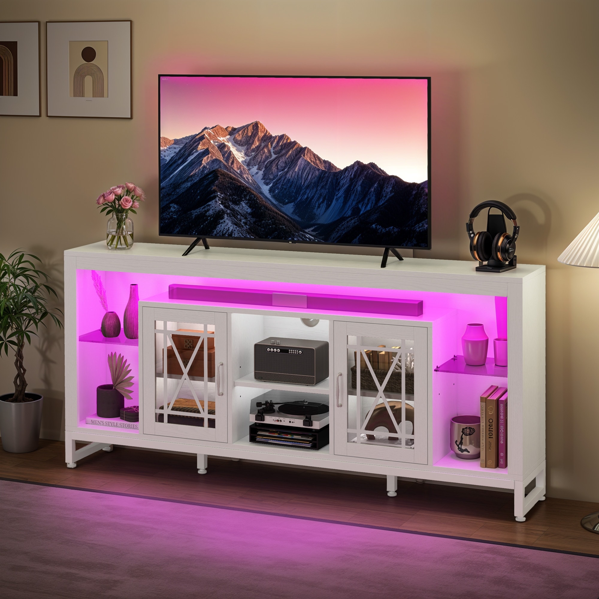 Moasis Modern LED TV Stand Acrylic Doors Entertainment Center with Power Outlets Adjustable Glass Shelves