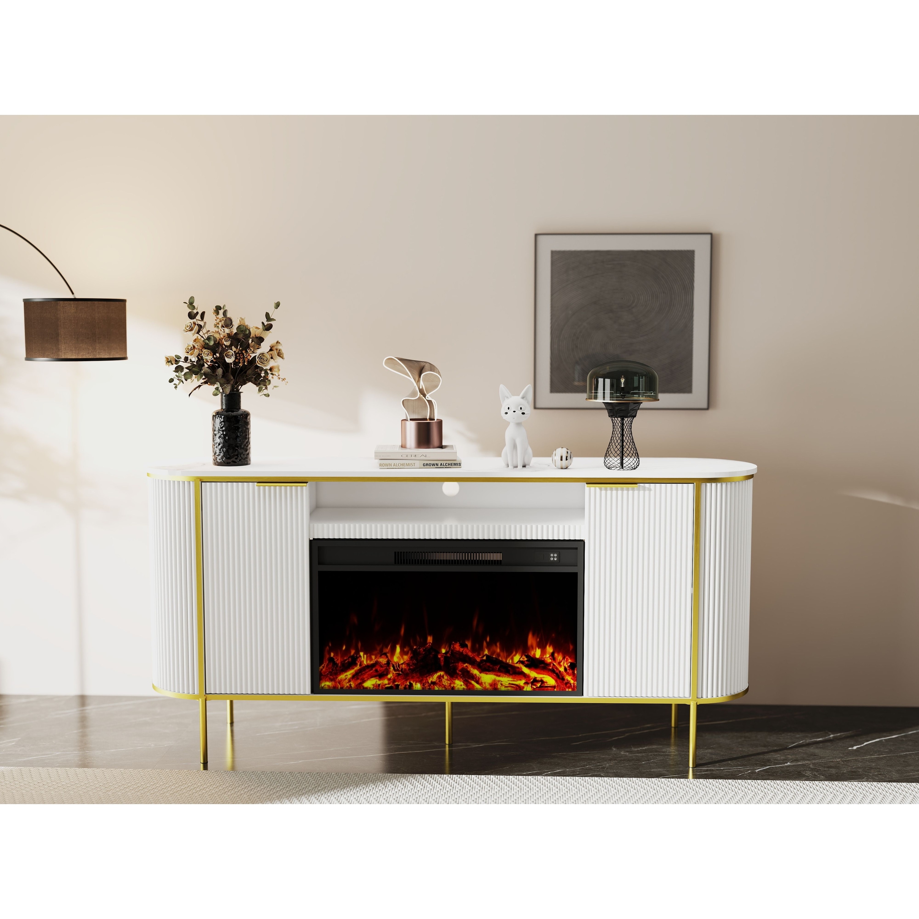 Modern Wood Electric Fireplace TV Stand with Glass Shelves, 3D Fireplace TV Stand with LED Lights & USB Charging Outlet