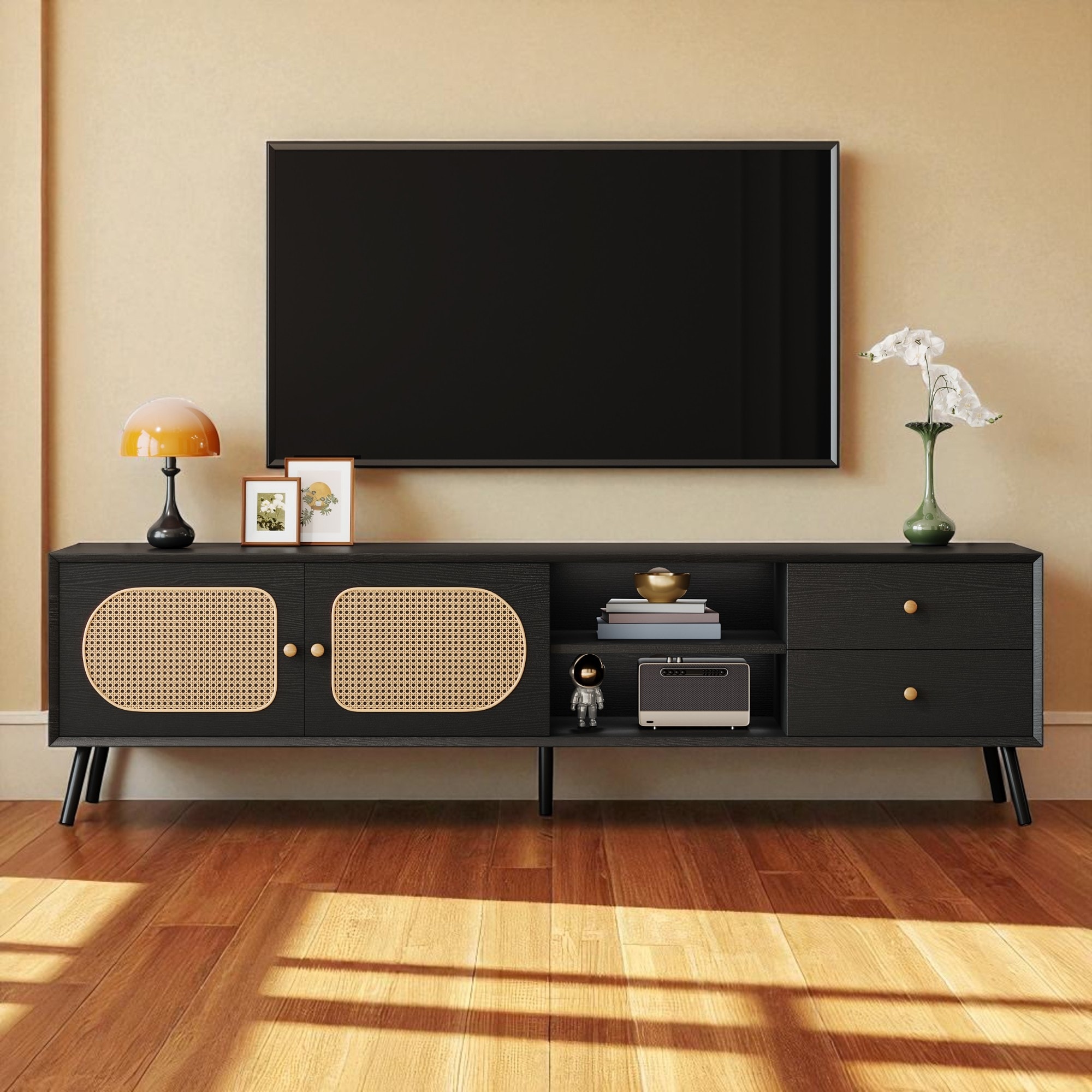 70 Inch Mid Century Modern TV Stand for TVs Up to 80 Inch, Entertainment Center with Rattan Doors, 2 Drawers and Open Shelves