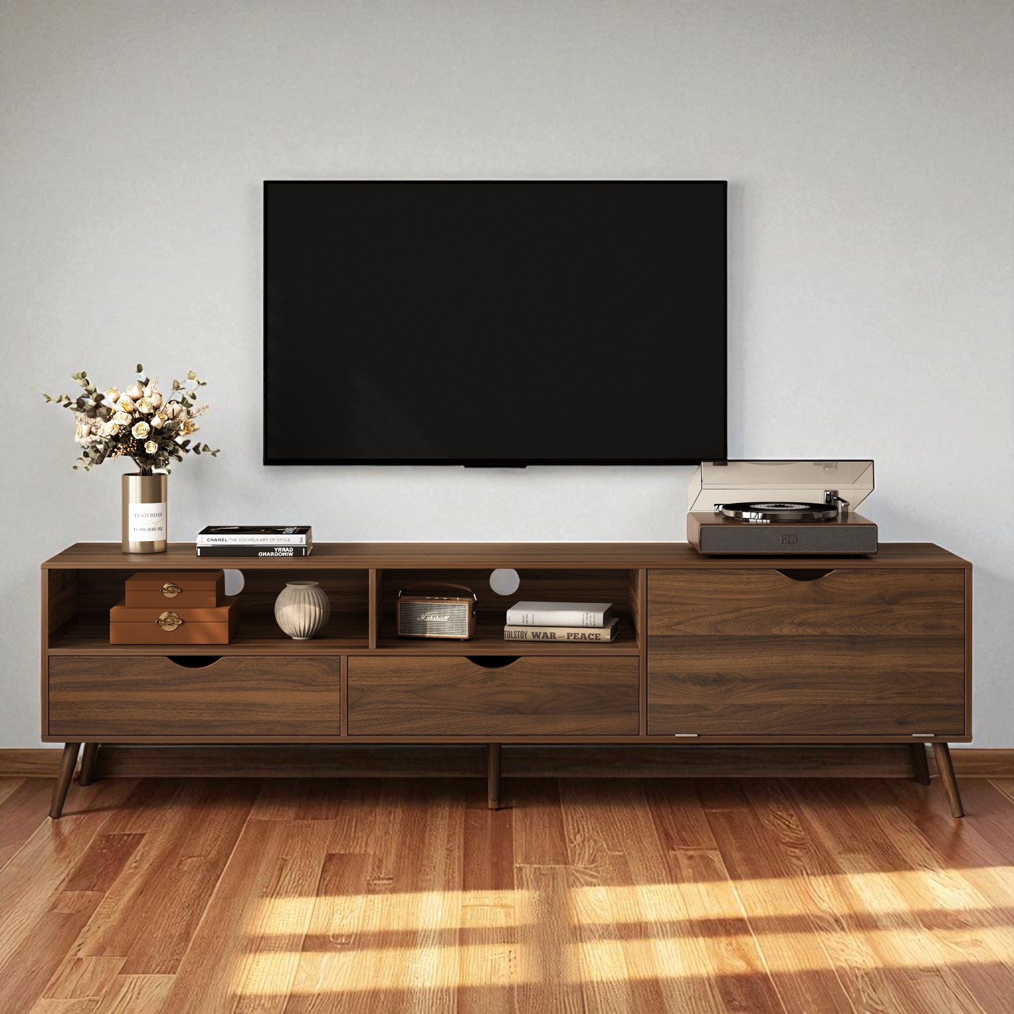 70.8 Inch Mid Century Modern TV Stand with 2 Drawers, Drop-Down Door, Cabinets and Open Storage for TVs Up to 80 Inch