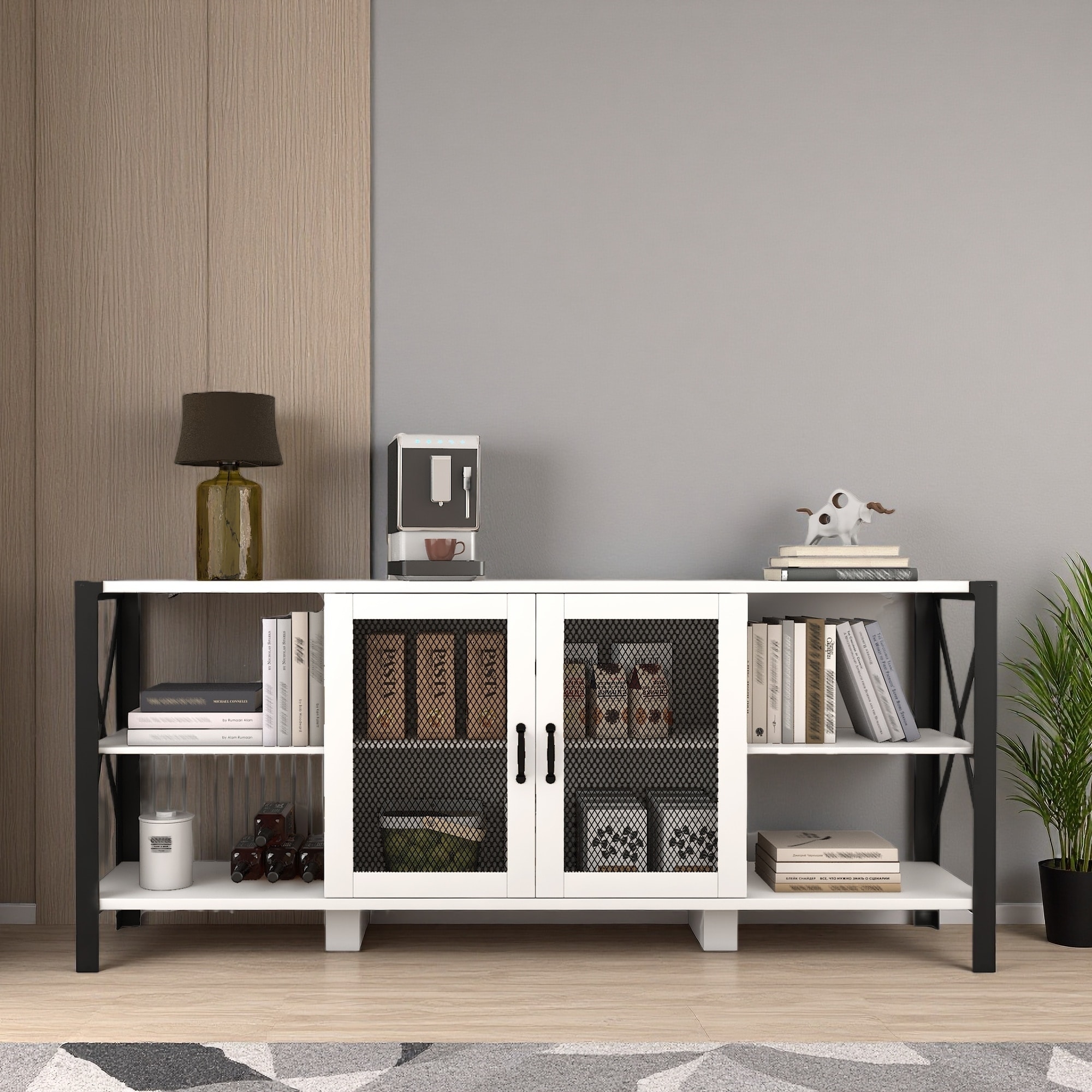 Industrial TV Stand with Mesh Doors, Open Shelves & Storage Cabinets