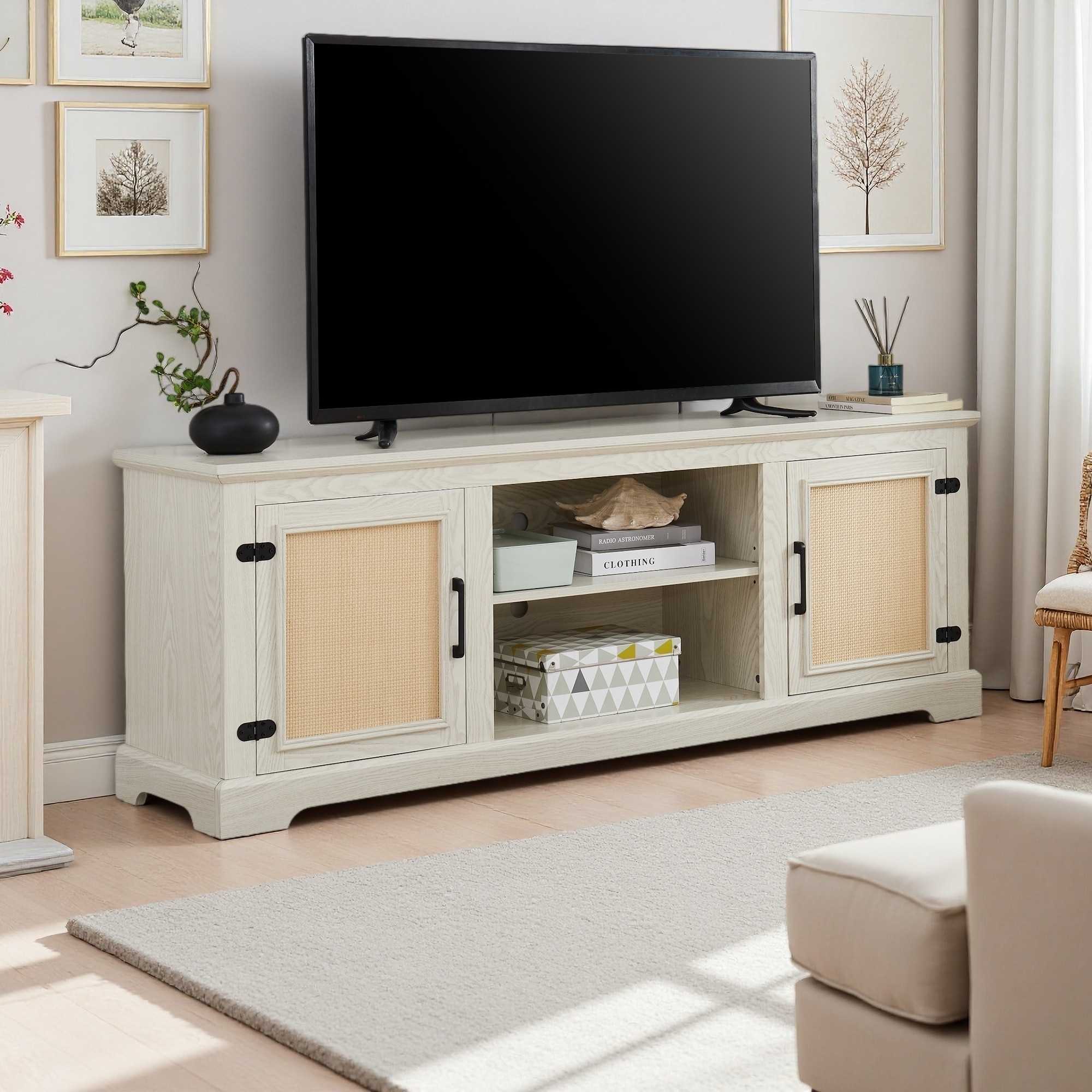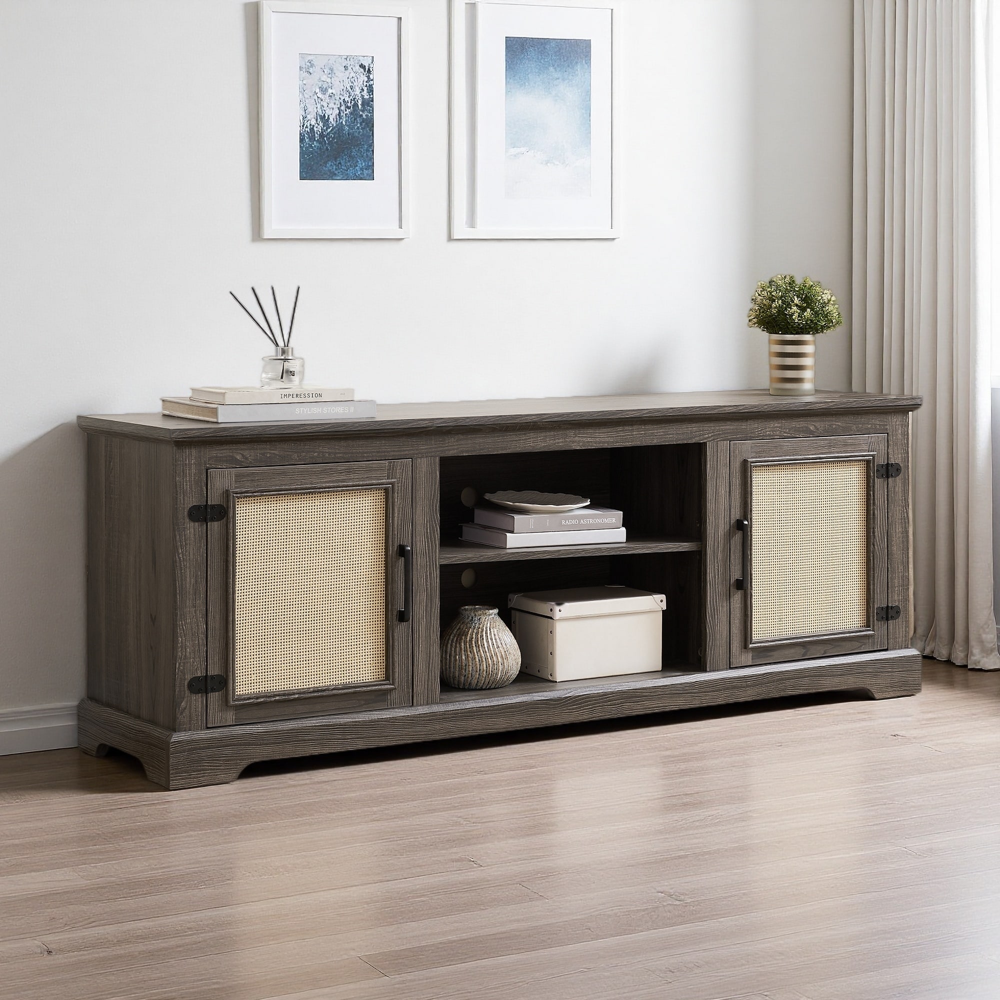 65" Farmhouse TV Console with 2 Open Shelves & 2 Door Cabinets