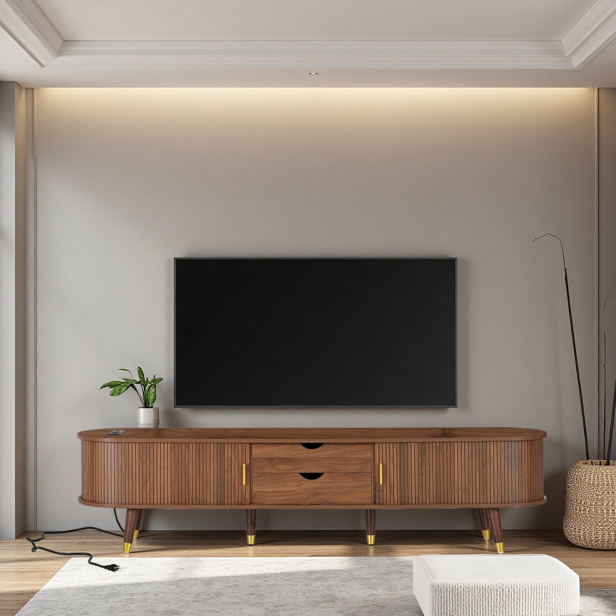 74.8" TV Stand with Built-in AC/USB Charging Station, Golden Handle Mid-Century Wooden Media Console for TVs up to 80"