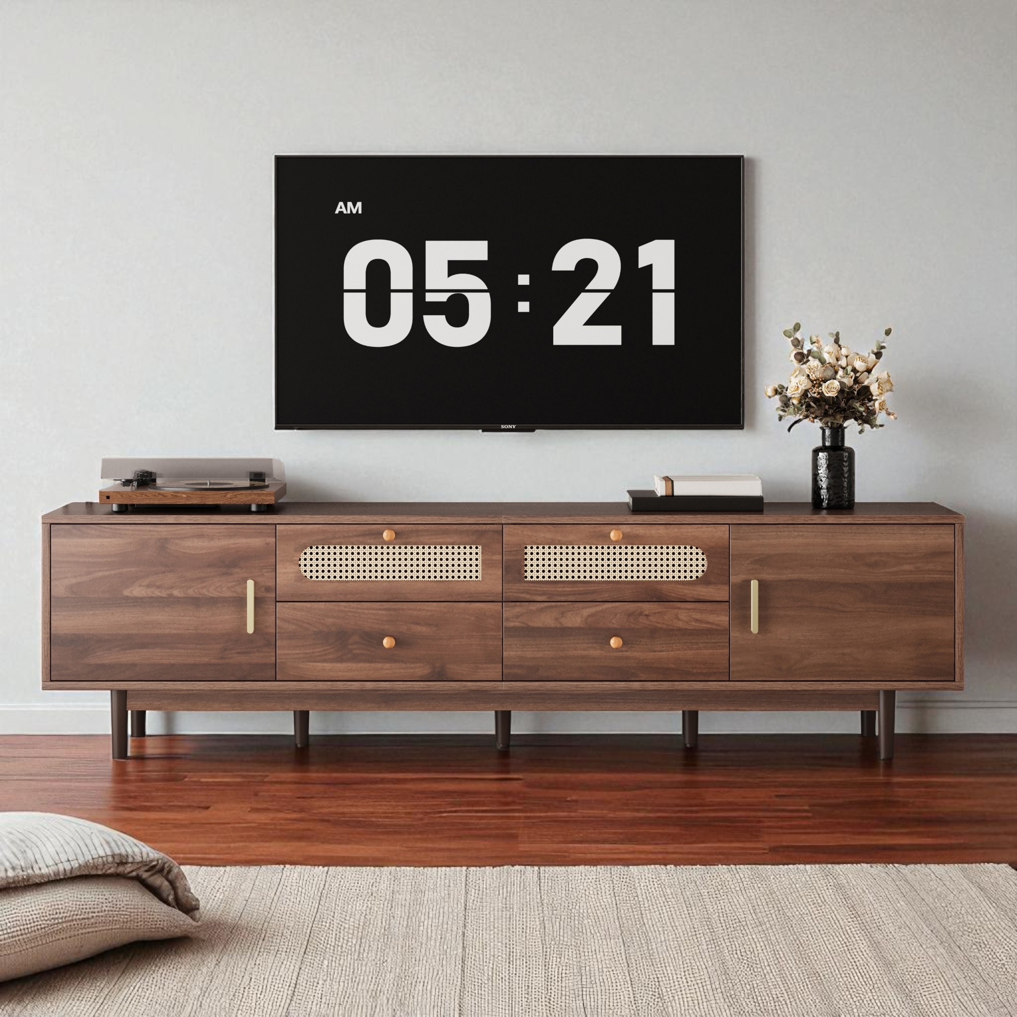 76 Inch Modern TV Stand with Storage, Rattan Doors, Drawers, Solid Wood Legs, Entertainment Center for TVs Up to 85"