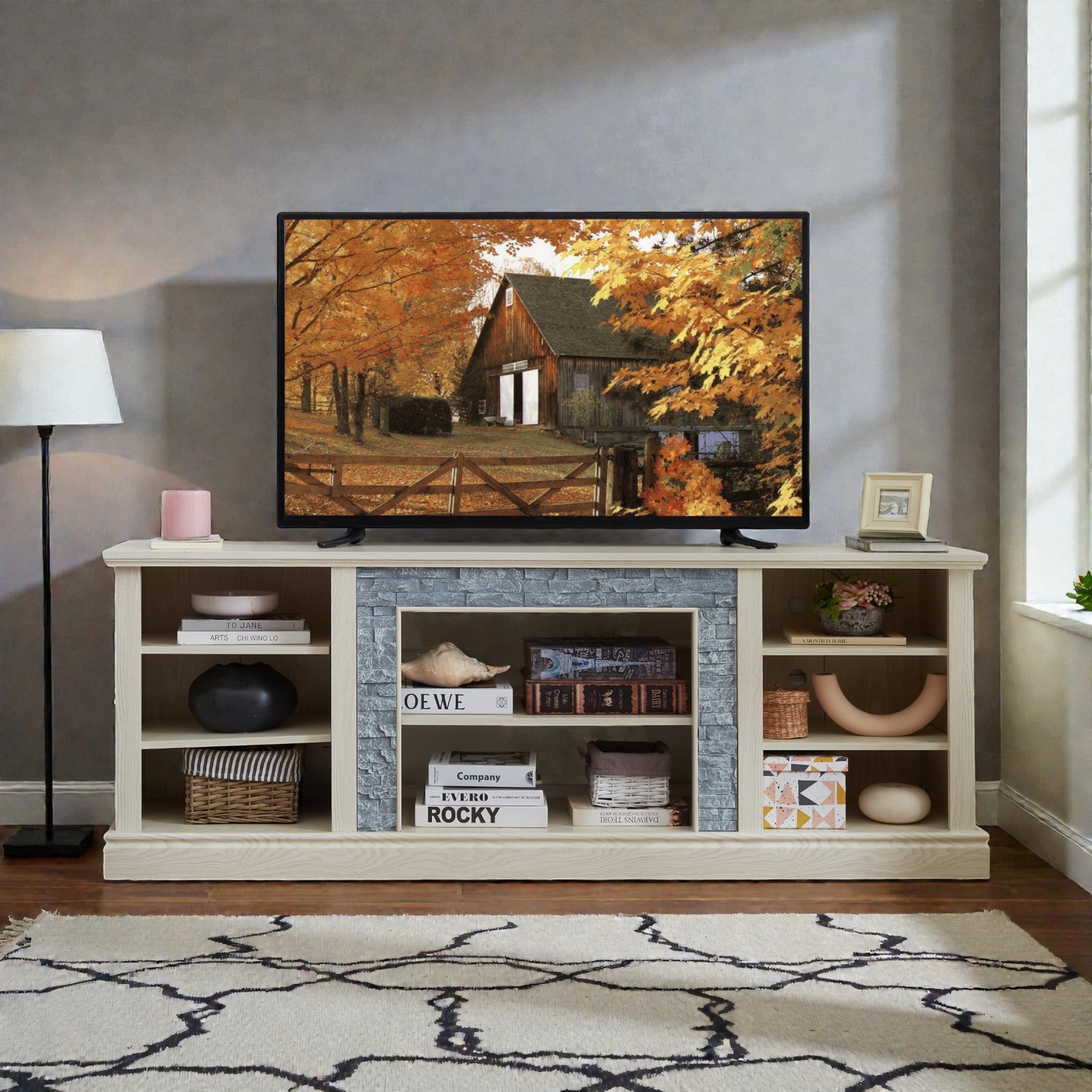 70" White Modern TV Stand with Faux Stacked Stone Surround, Large Media Console Cabinet for TVs up to 75"