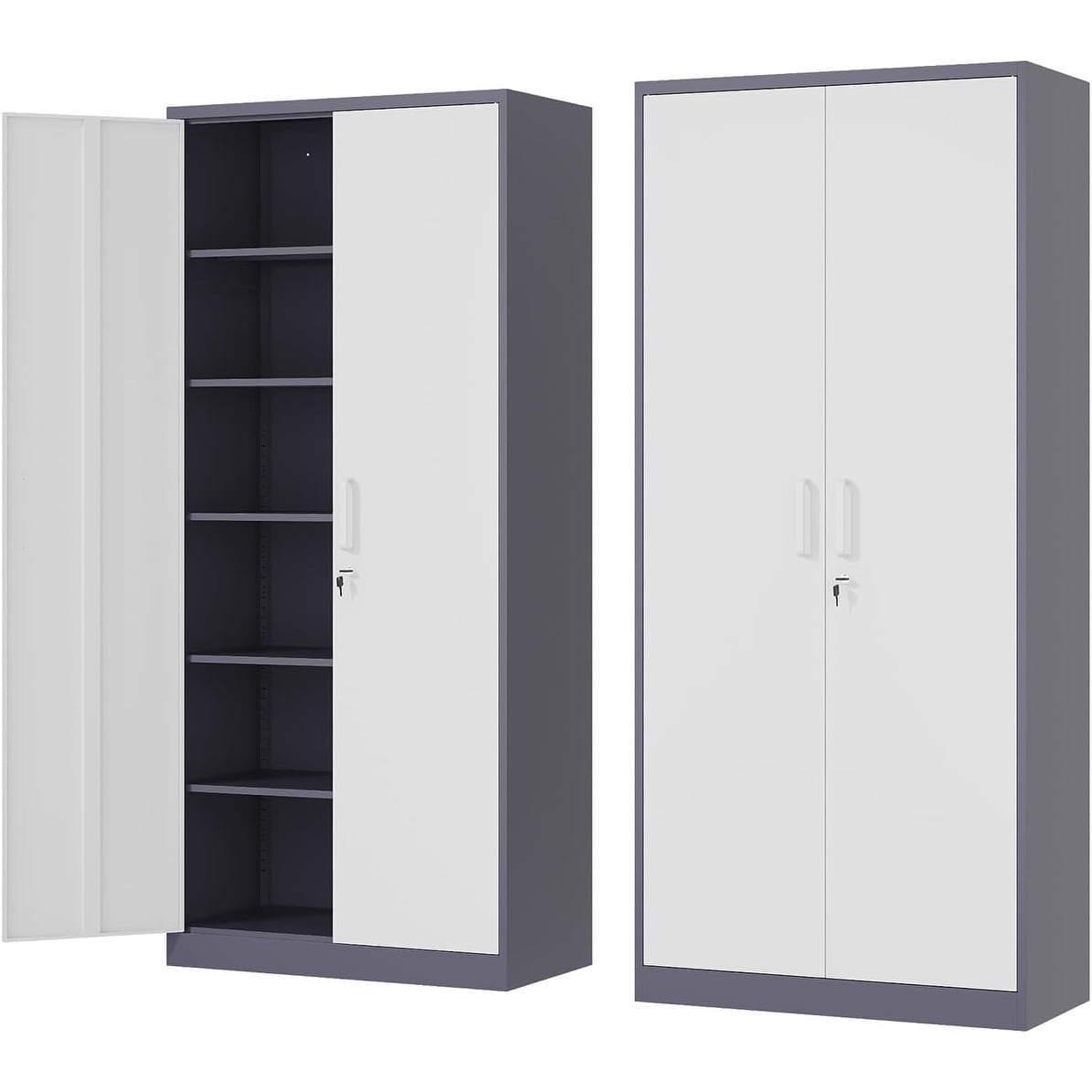 72'' Tall Steel File Cabinet with Lockable Doors, 5 Adjustable Shelves, Gray&White