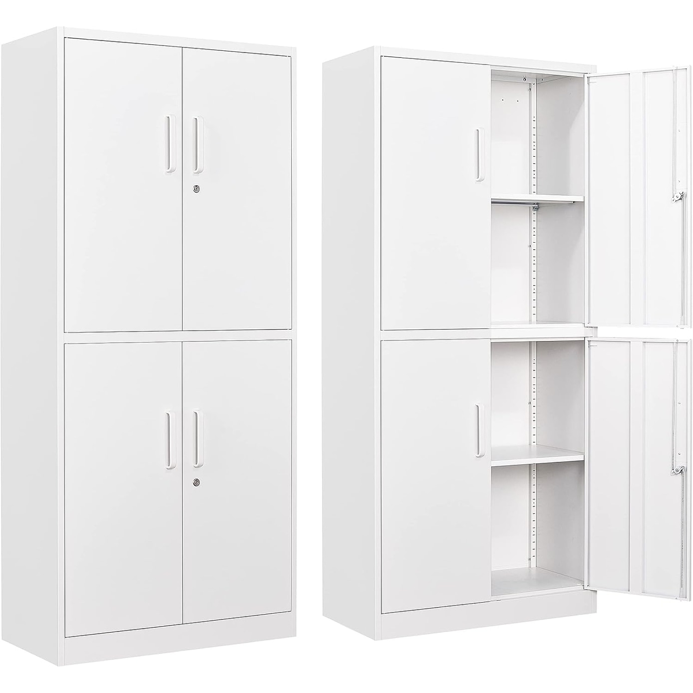 White Metal Storage Cabinet with 3 Adjustable Shelves, Lockable 4-Door Pantry Cabinet for Home, Office, Garage, Kitchen