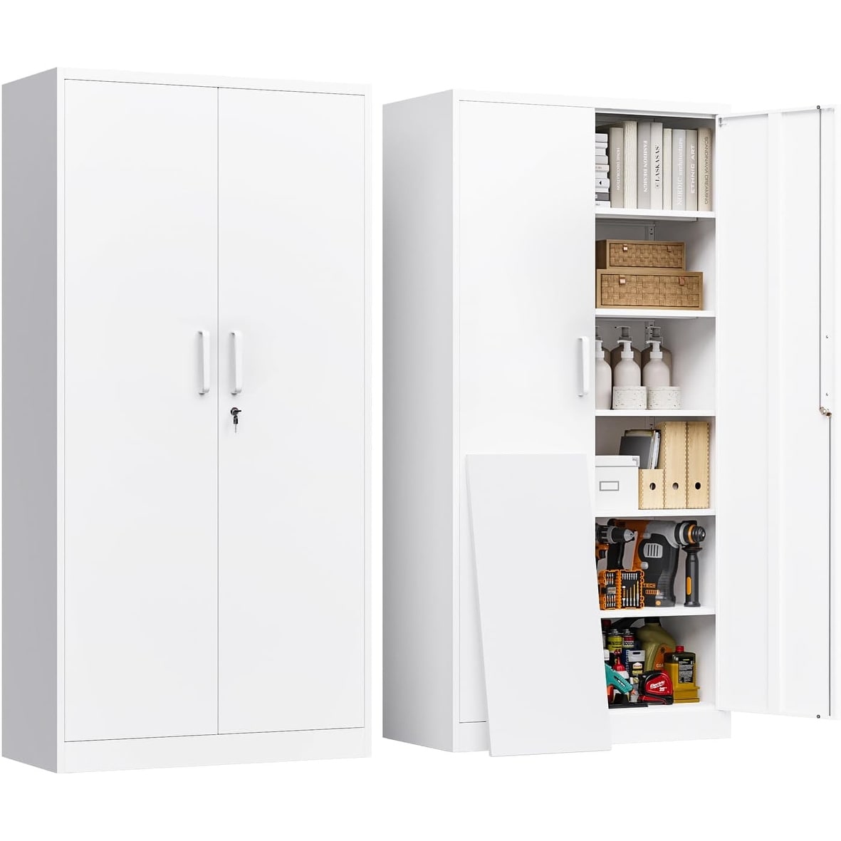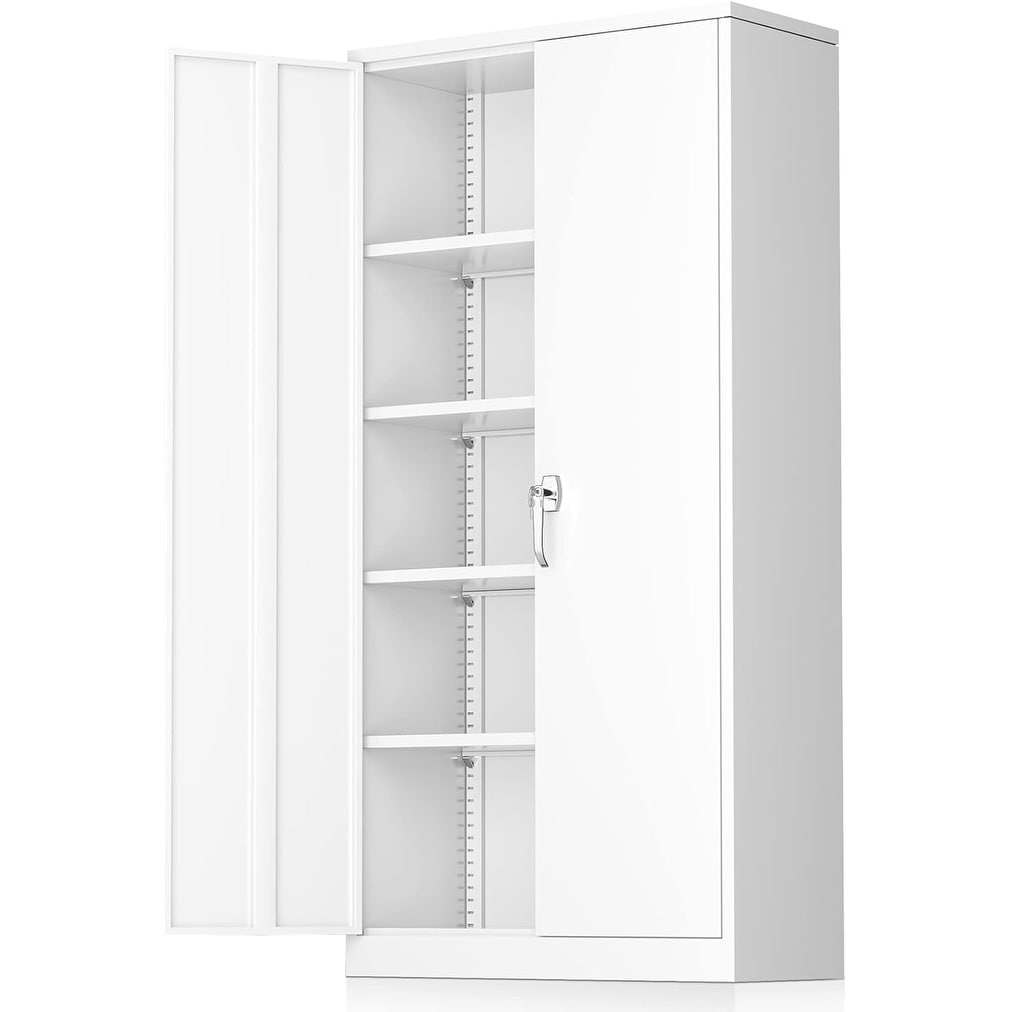72-Inch Tall White Metal Storage Cabinet with Lockable Doors and 5 Adjustable Shelves for Garage and Home Office