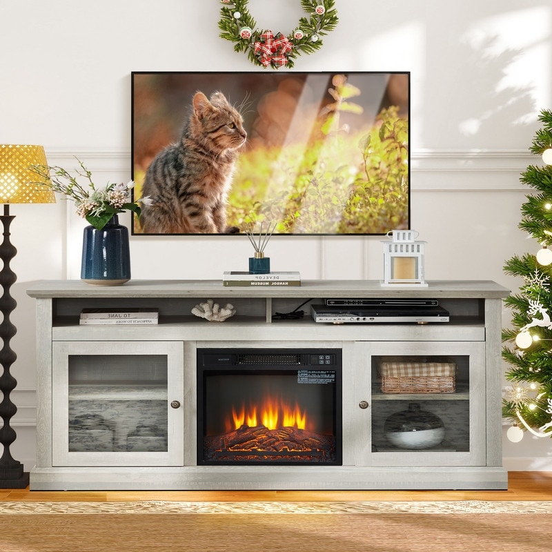 60 in. Freestanding TV Stand with 18 in. Fireplace Insert, Classic American Design, Open and Closed Storage, Brown/Grey