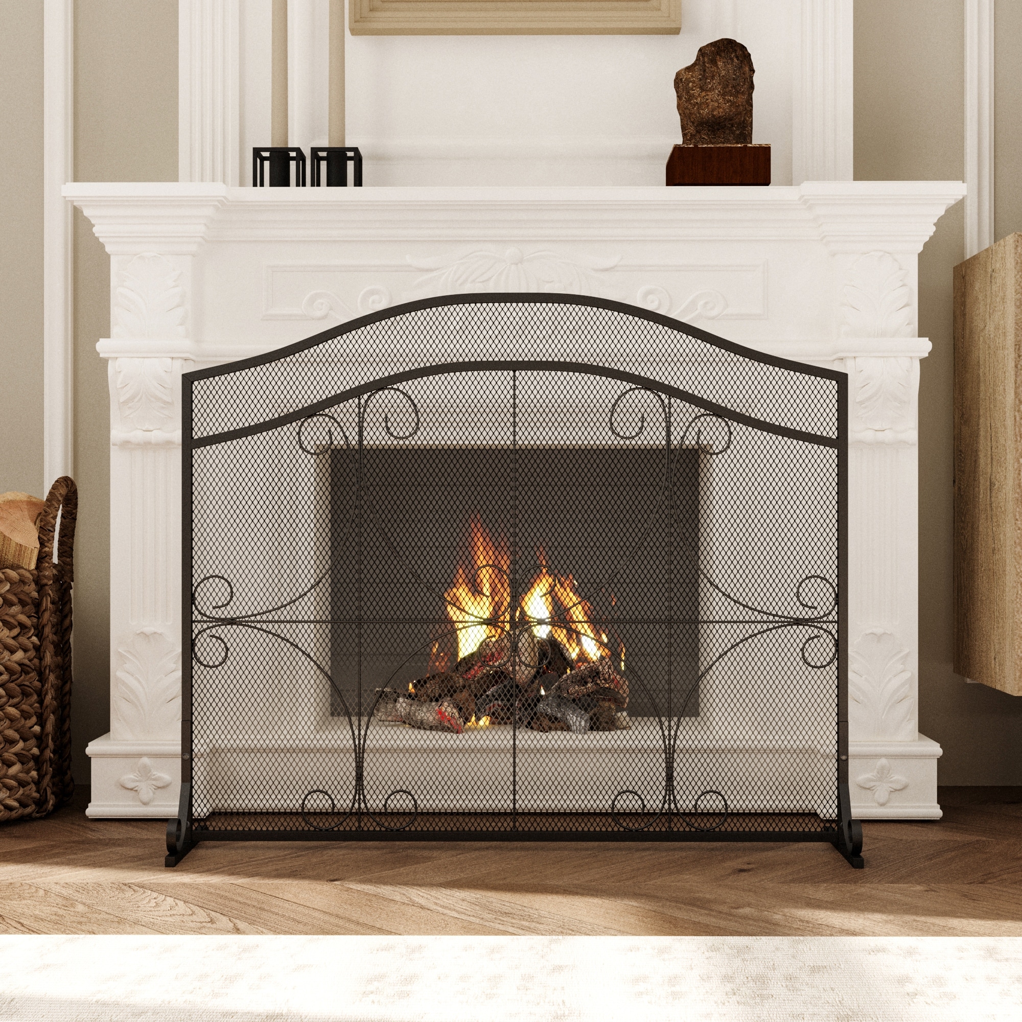 Arched Black Iron Fireplace Screen with Decorative Scrollwork, Rustic Spark Guard for Fireplace Safety