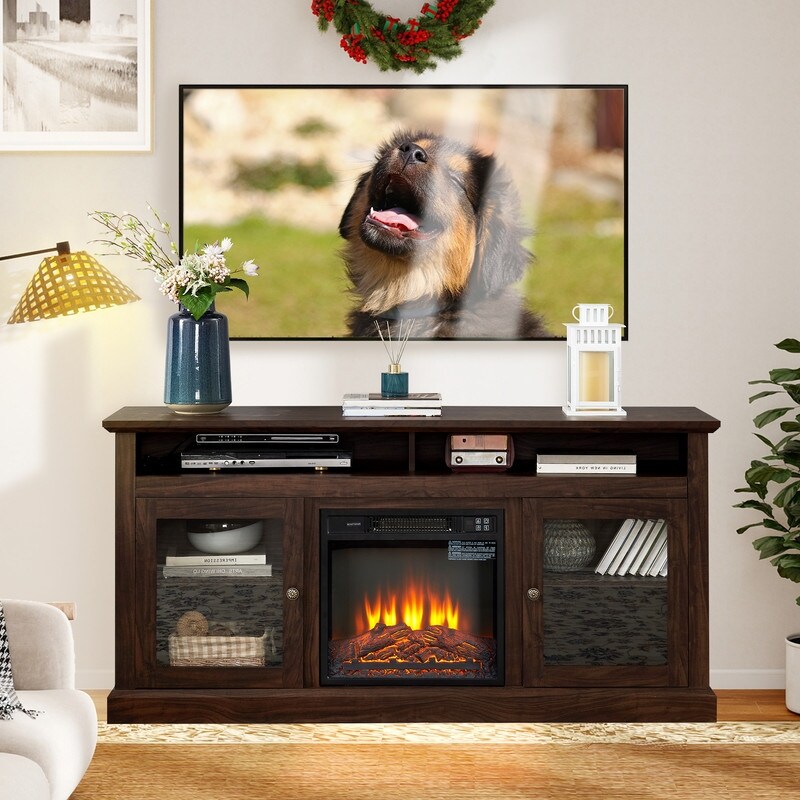 60 in. Freestanding TV Stand with 18 in. Fireplace Insert, Classic American Design, Open and Closed Storage, Brown/Grey