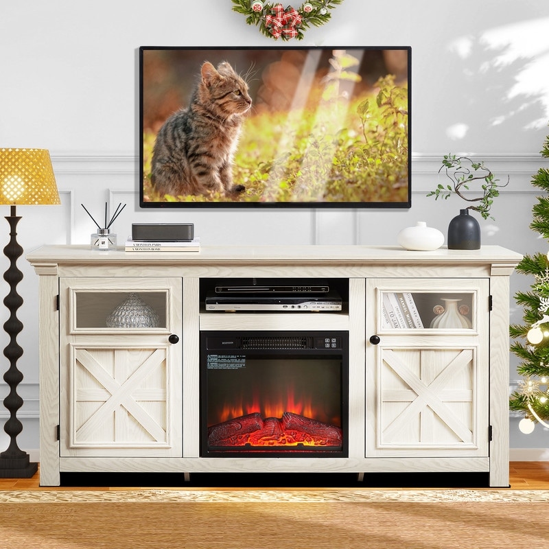60 in. TV Stand with 18 in. fireplace insert 2 Doors Cabinet Farmhouse Cabinet, Farmhouse Barn Design,White - 60Inch