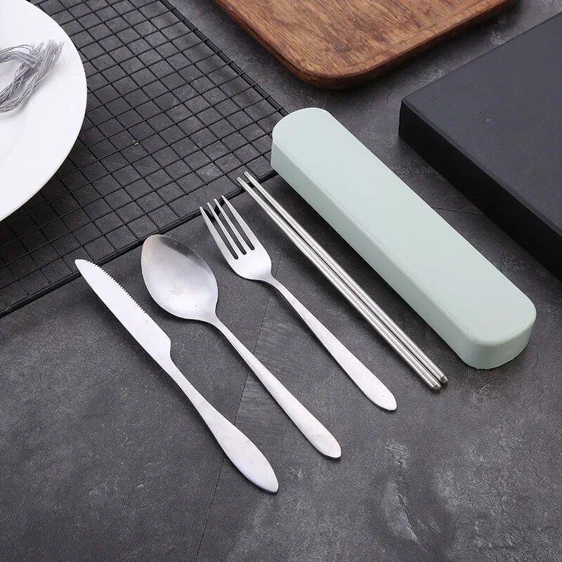 4Pcs Set Portable Stainless Steel Cutlery Set For Travel Camping Includes Chopsticks, Spoon, Fork, Steak Knife With St green