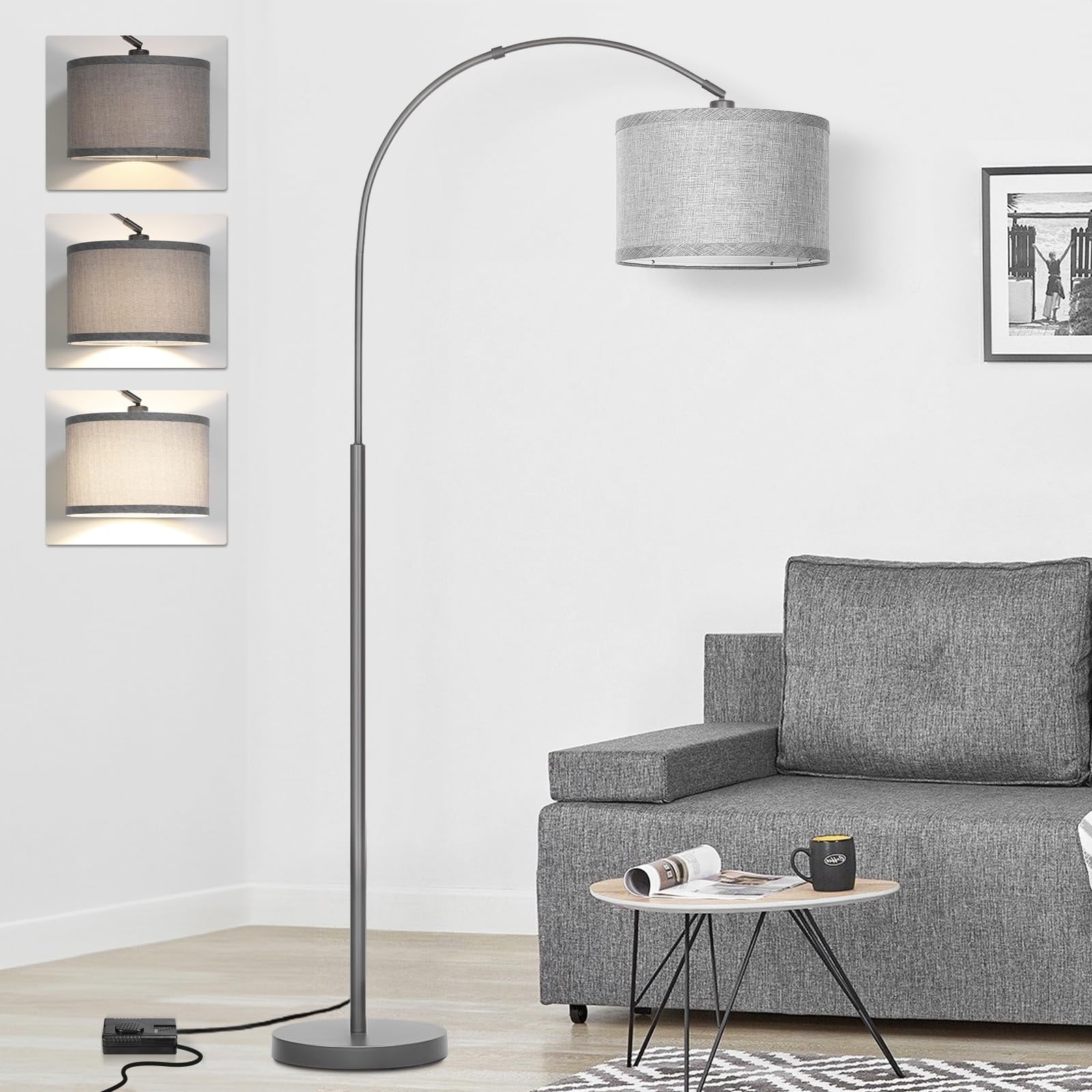 Arc Floor Lamp with Dimmer,Modern Standing Lamp with Gray Adjustable Hanging Shade,Tall Pole Lamp Reading Light9W LED Bulb