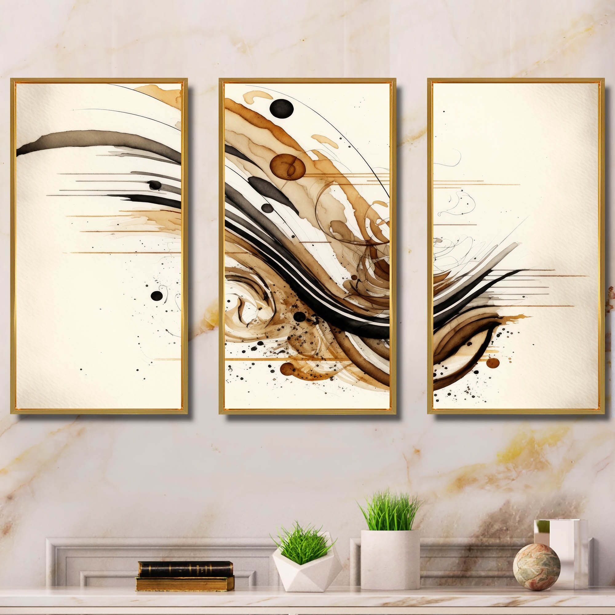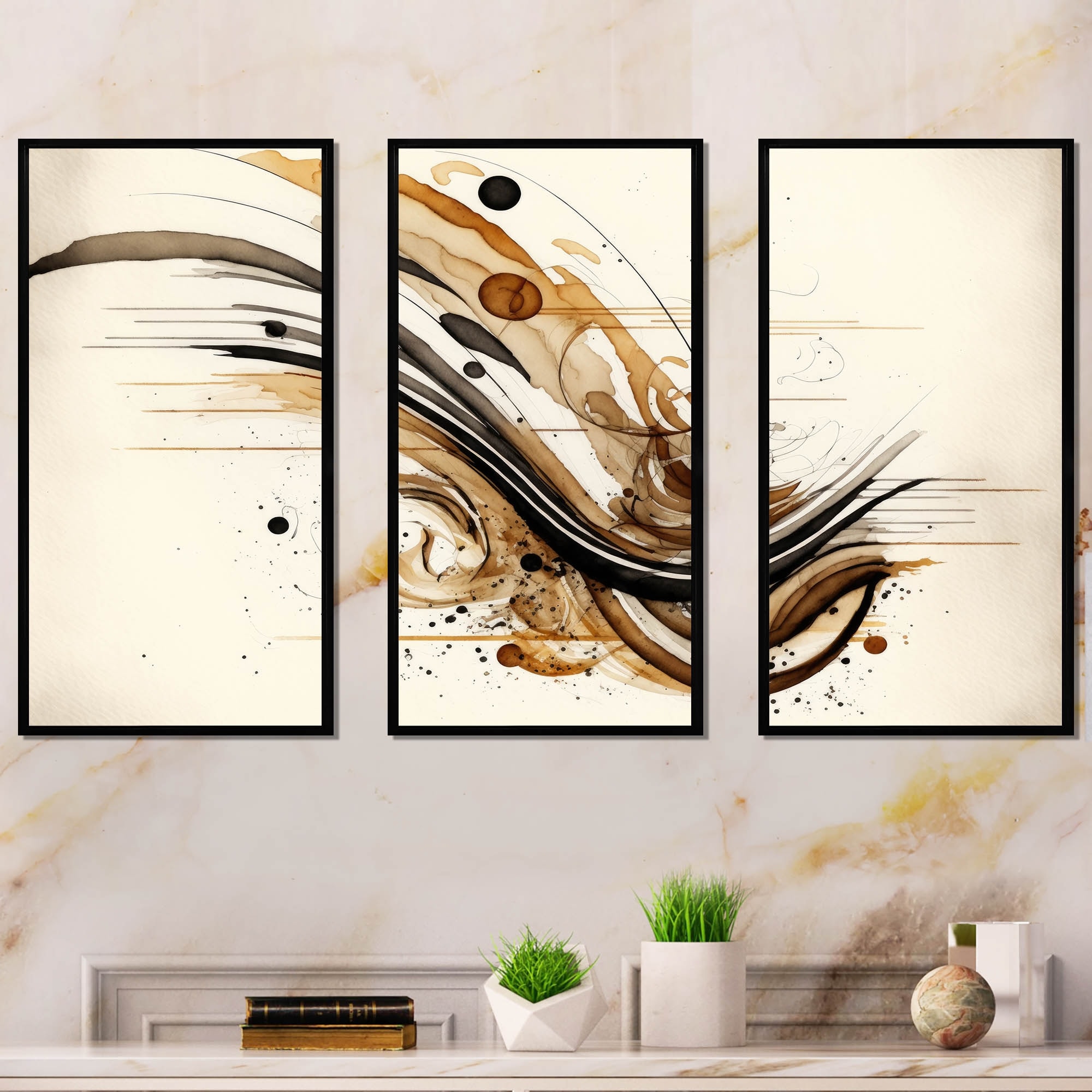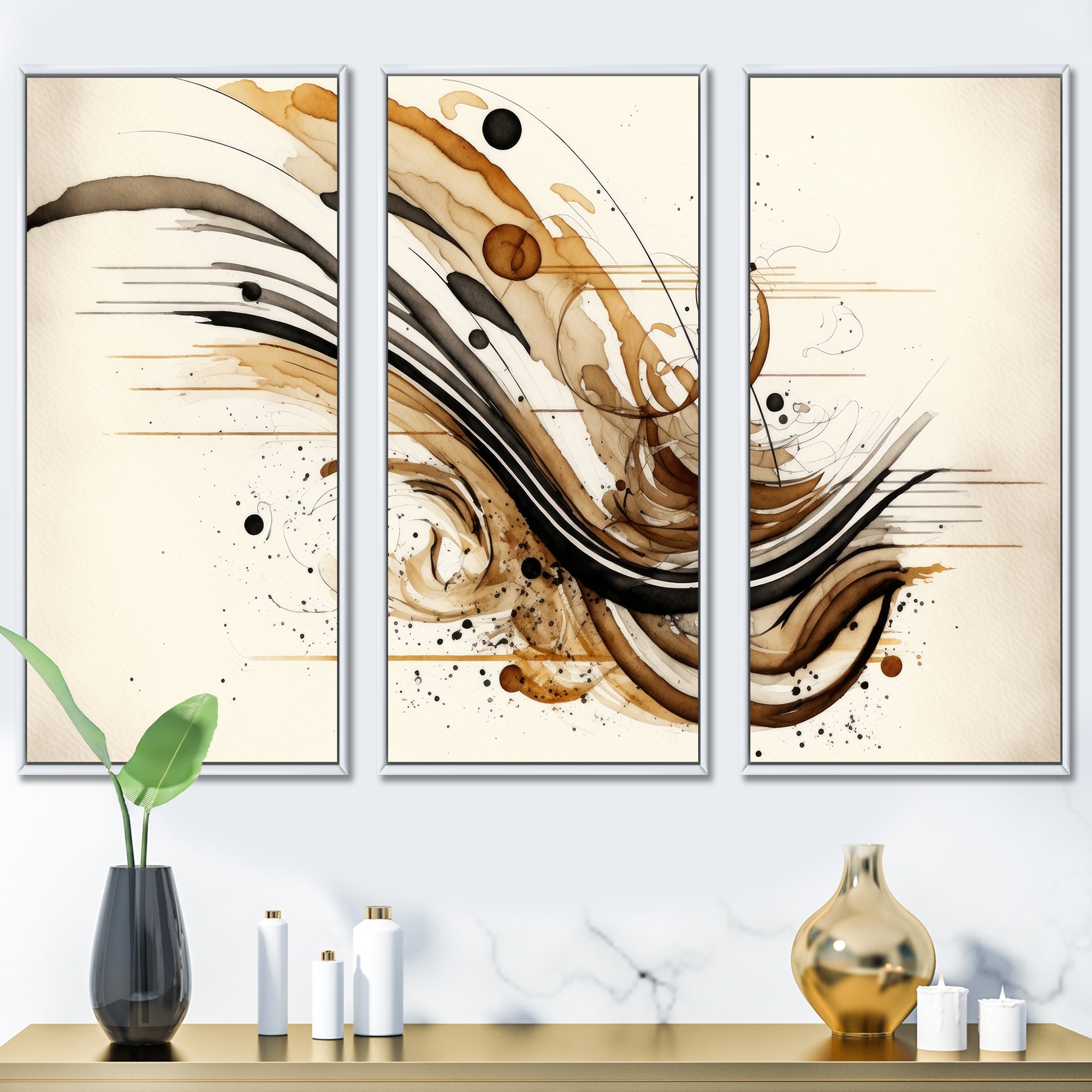 Designart "Brown And Black Movement I" Modern Waves Framed Canvas Art Print - 3 Panels
