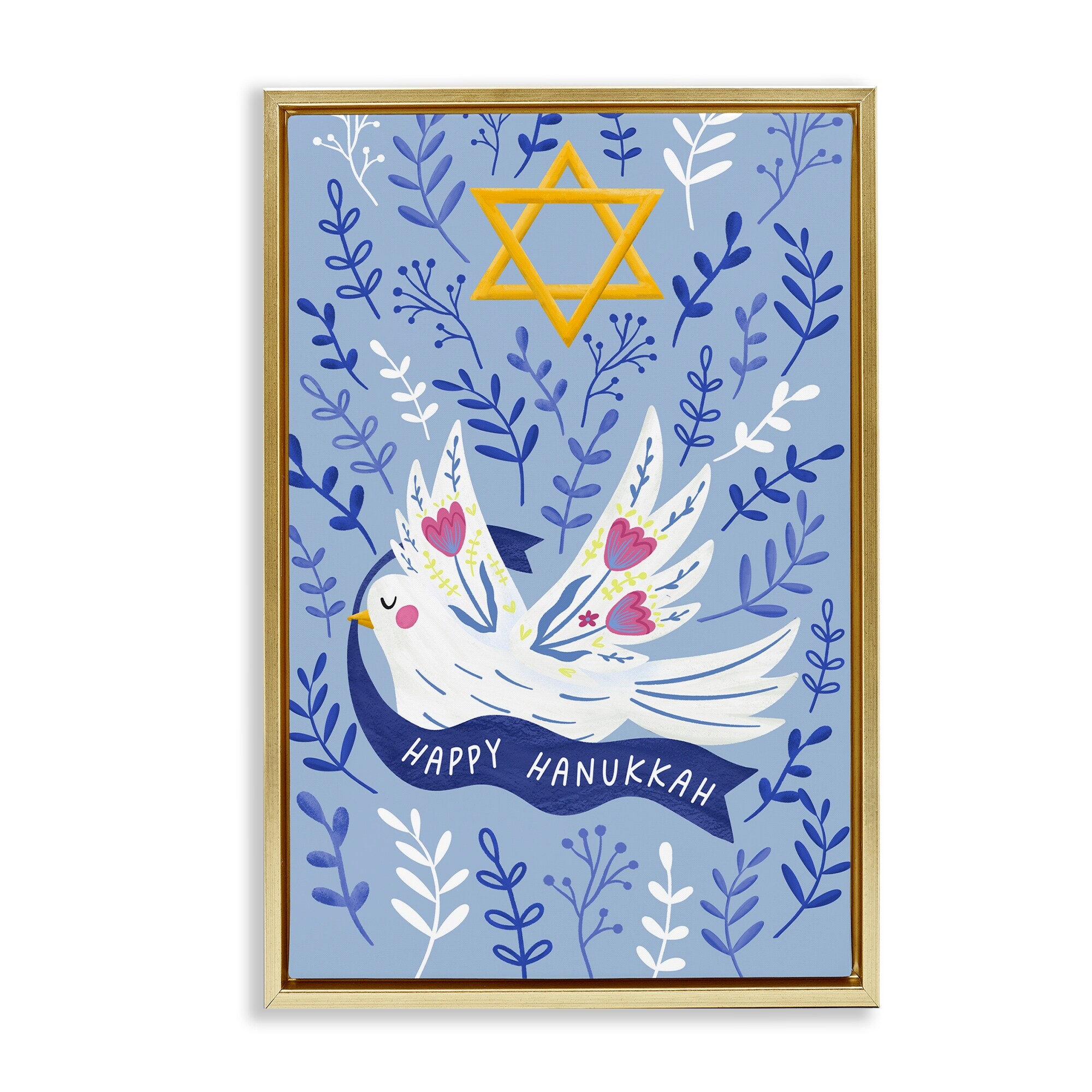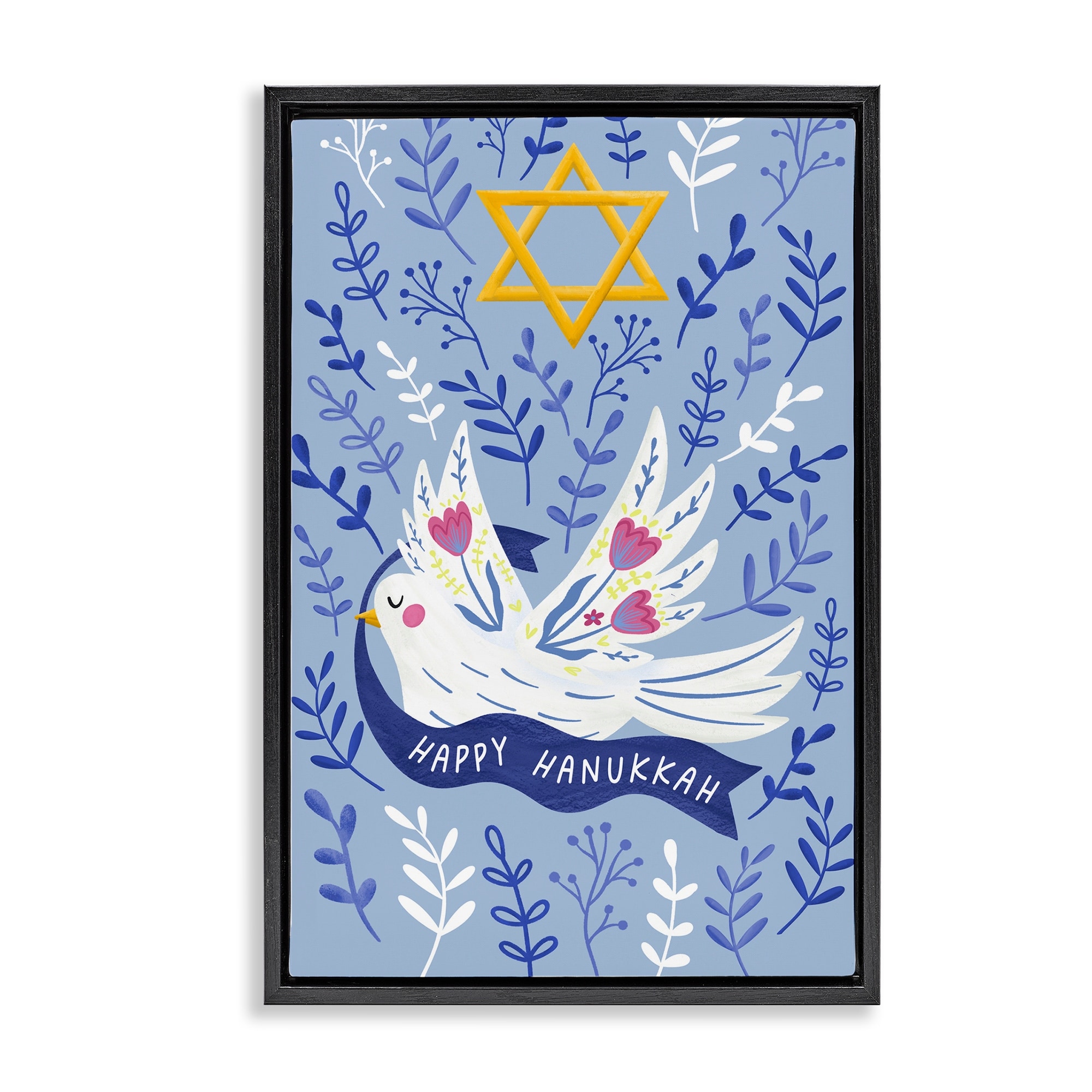 Stupell Happy Hanukkah Dove & Florals Framed Floater Canvas Wall Art Design By JJ Design House LLC
