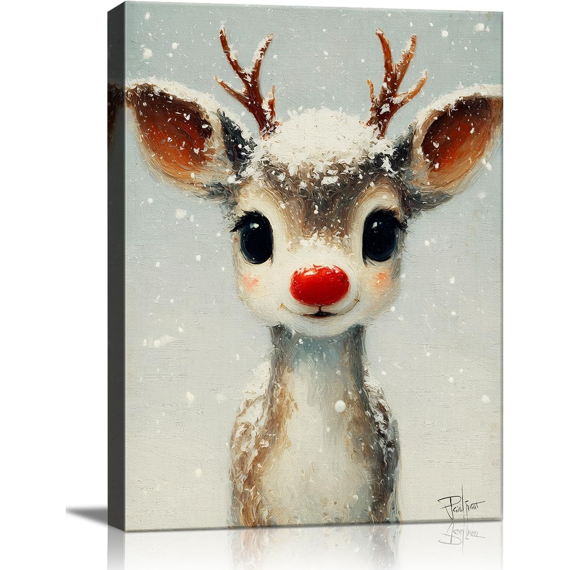 Funny Red Nose Deer Christmas Canvas Wall Art