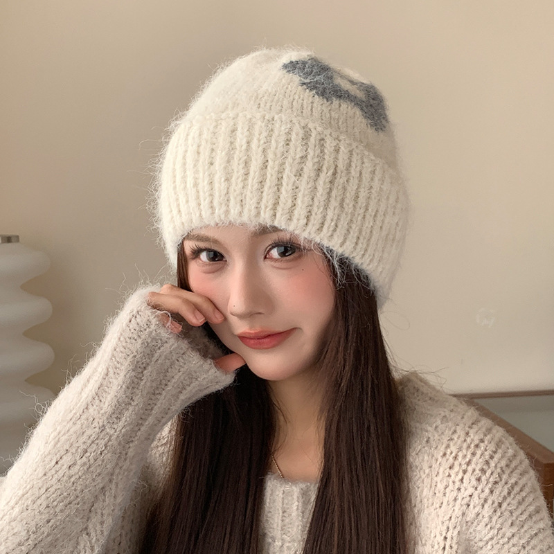 Korean Style Women's Winter Hat With Flower And Ear Protection Wool Hat Big Head Circumference Wool Hat beige