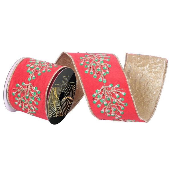 Vickerman 799130 - 4"x5yd Red Dupion Green/Gold Leaf Rd Jwl (QK252803) Red Colored Christmas Ribbons