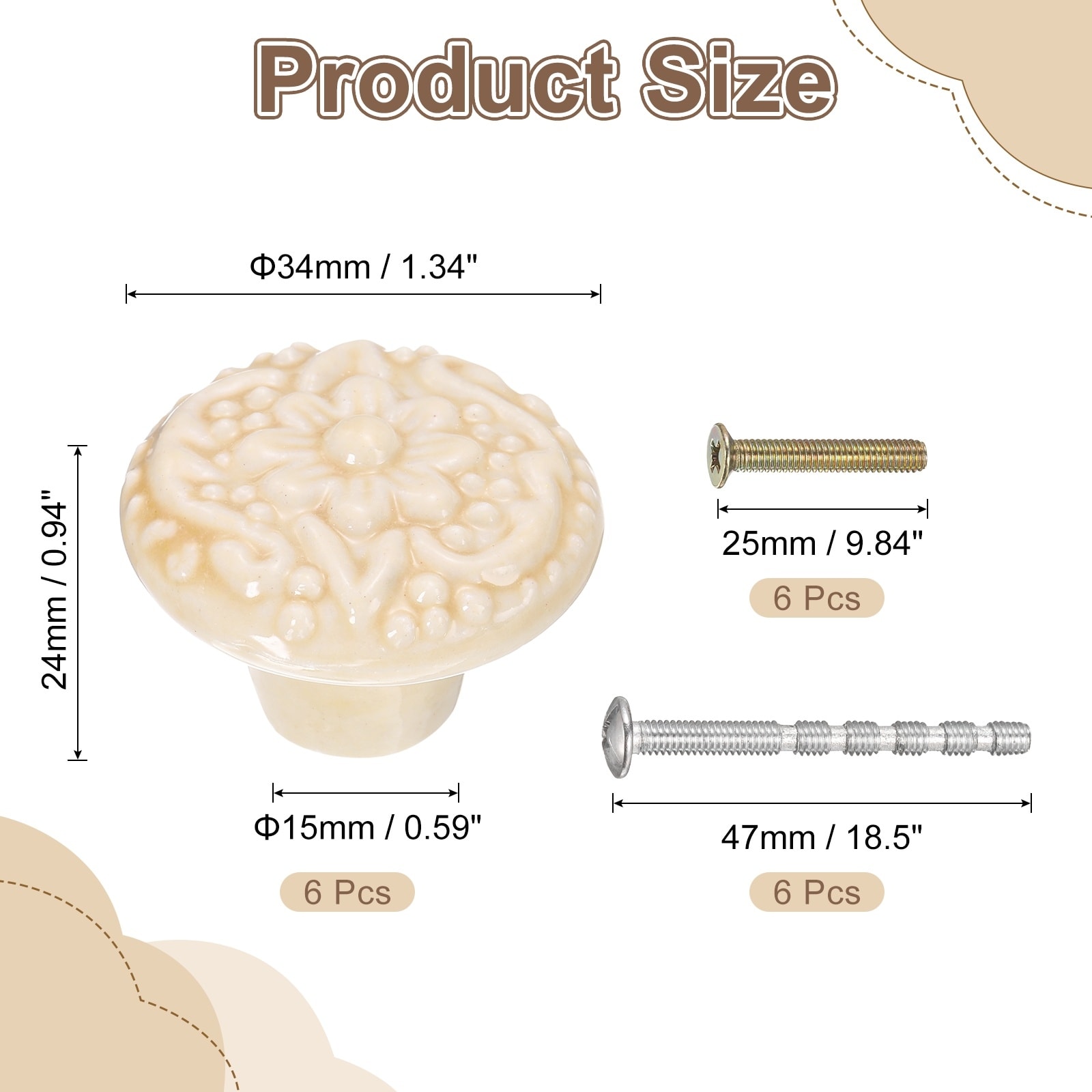 10Pcs 34mm Flower Pattern Ceramic Knobs with Screws, Light Yellow