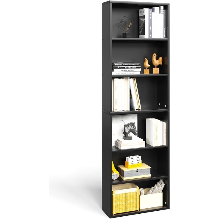 6-Tier Tall Narrow Bookshelf, Modern Open Storage Cabinet for Living Room & Office, Black Wood Grain Design