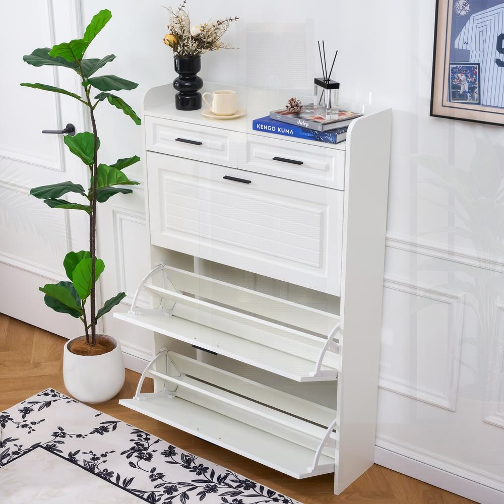 White Shoe Cabinet with 2 Drawers and Three Fold Doors