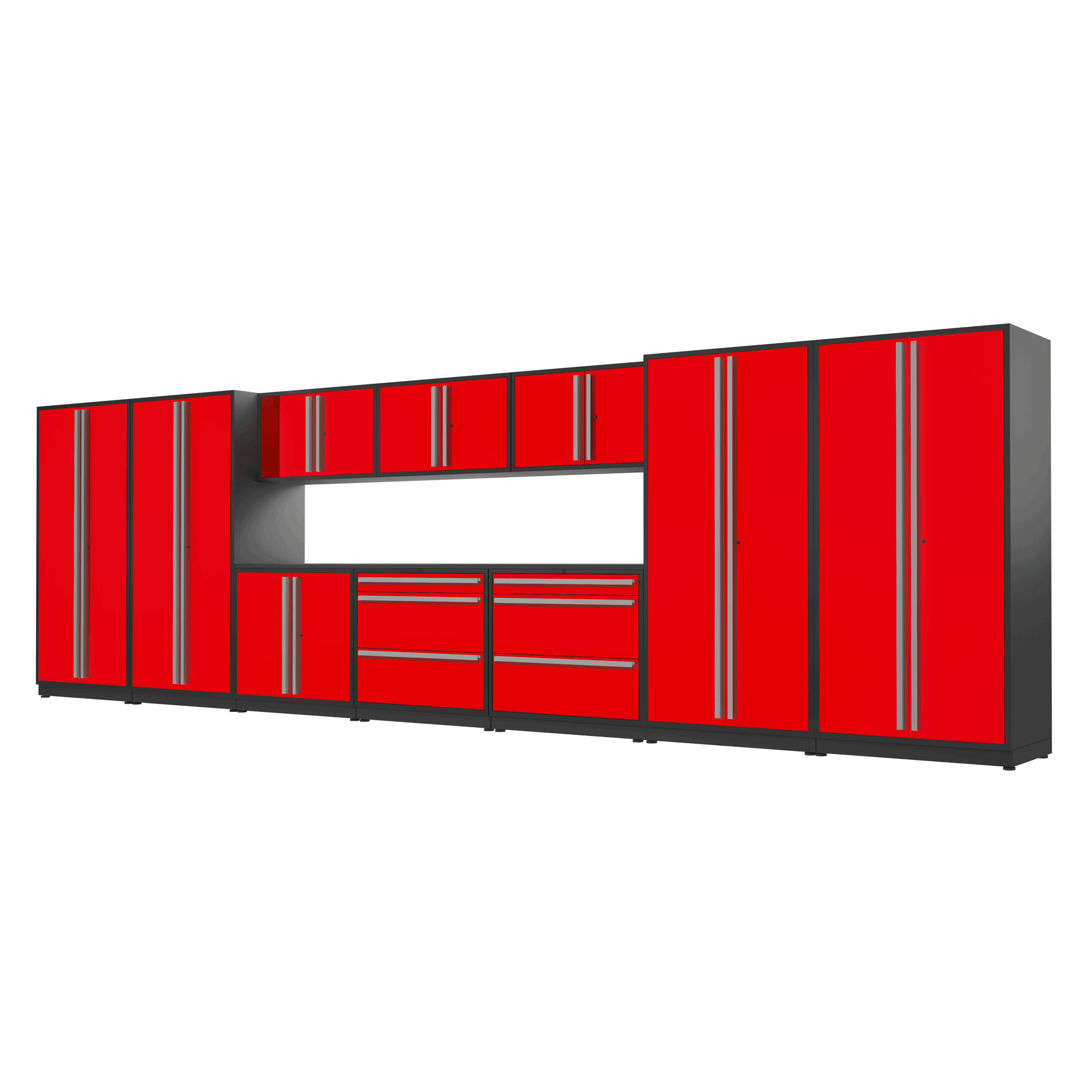 Newage Products Pro 3.0 Series 7-Piece Garage Cabinet Set, Red / Stainless Steel Worktop / Slatwall Backsplash