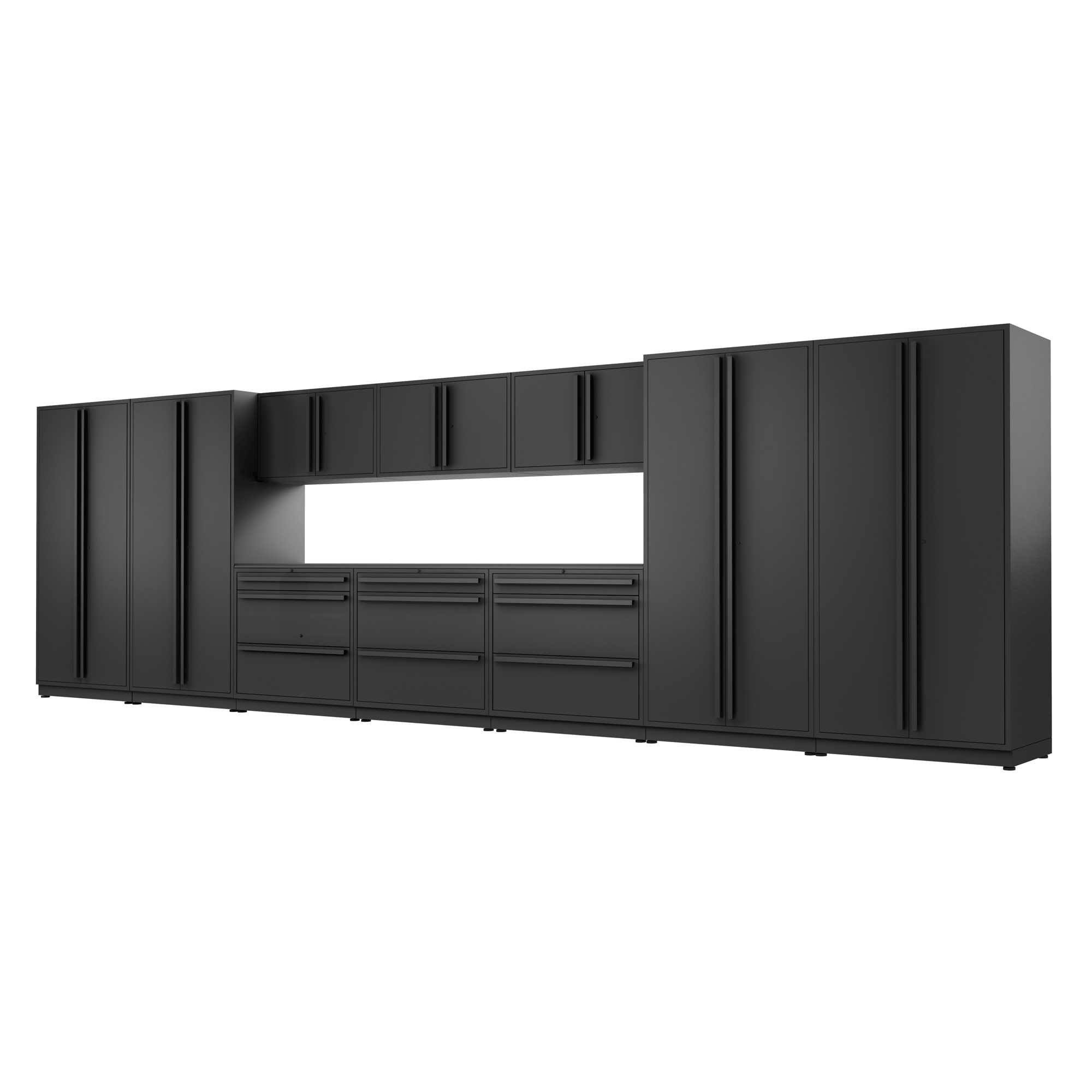 Newage Products Pro 3.0 Series 14-Piece Garage Cabinet Set With Multi-Function Cabinet, Black / Stainless Steel Worktop / LED Lights + Slatwall Backsplash