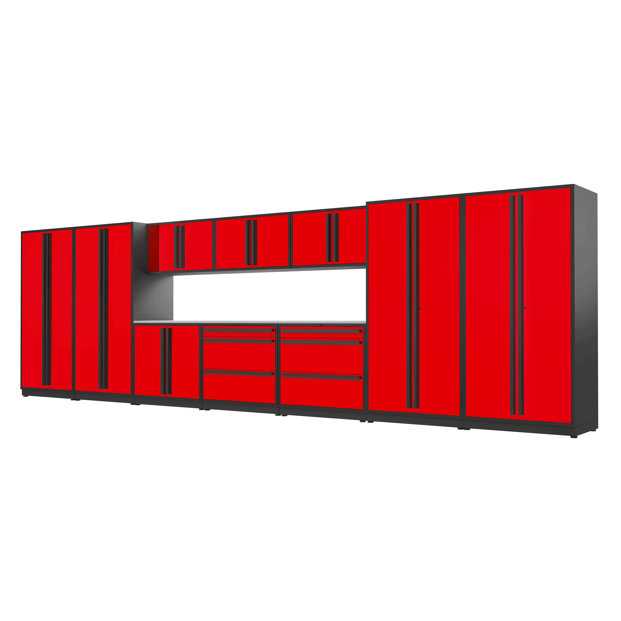 Newage Products Pro 3.0 Series 14-Piece Garage Cabinet Set, Red / Stainless Steel Worktop / Slatwall Backsplash