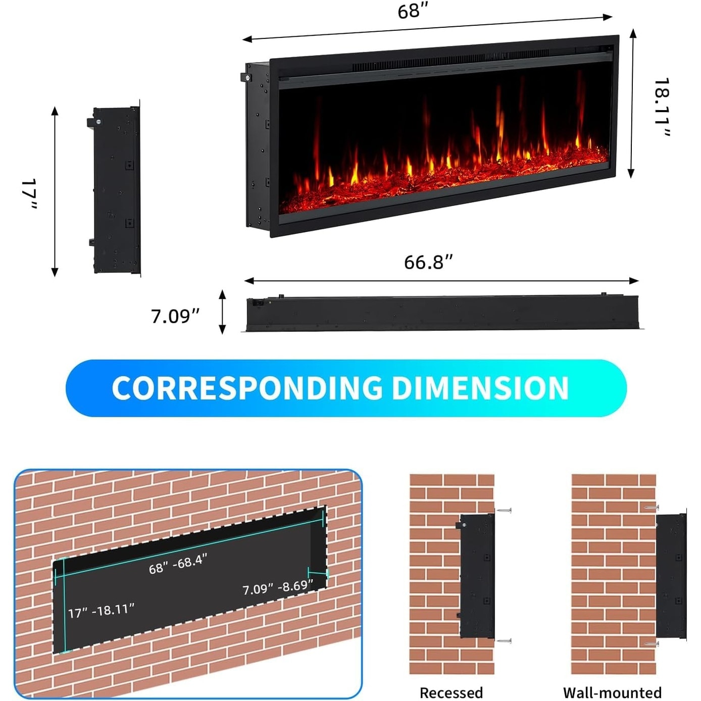 68 Inch Built-in Electric Fireplace with Timer & Remote Control,12 Realistic Flame Flickering Colors