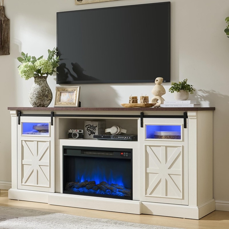 Farmhouse Fireplace TV Stand: 32’’ LED, 80” TV Capacity, Electric Fireplace & Barn Door - 15.63"D x 69.61"W x 32.11"H