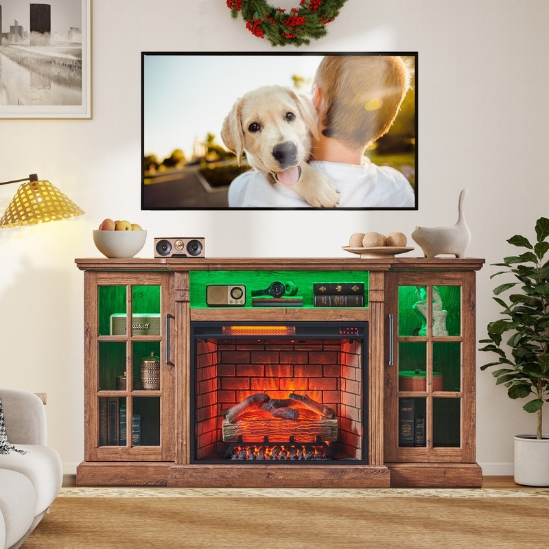65 in. Freestanding Fireplace TV Stand with 28 in. Electric Fireplace and LED Light in Brown, for TVs up to 75 in.,Brown