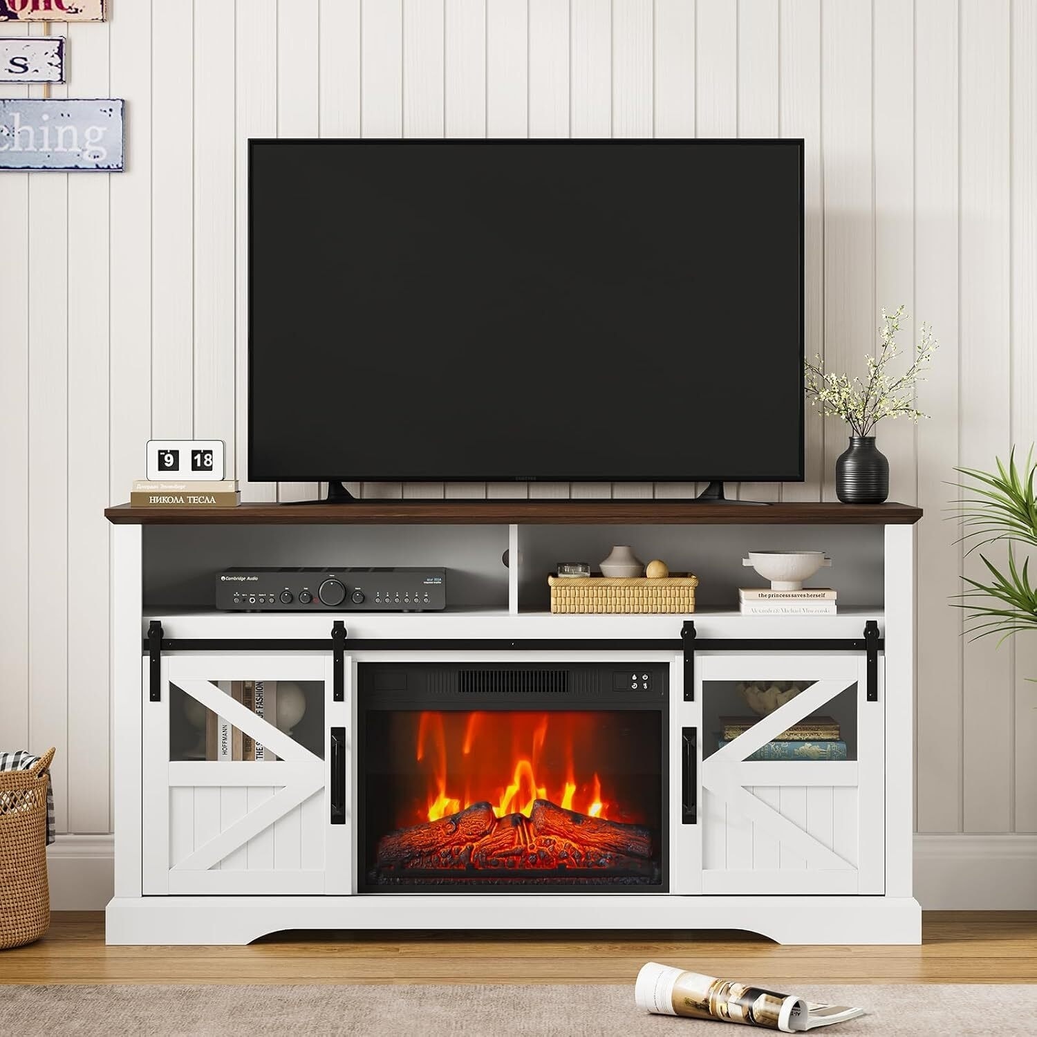 Farmhouse Electric Fireplace TV Stand Entertainment Center for Living Room, White
