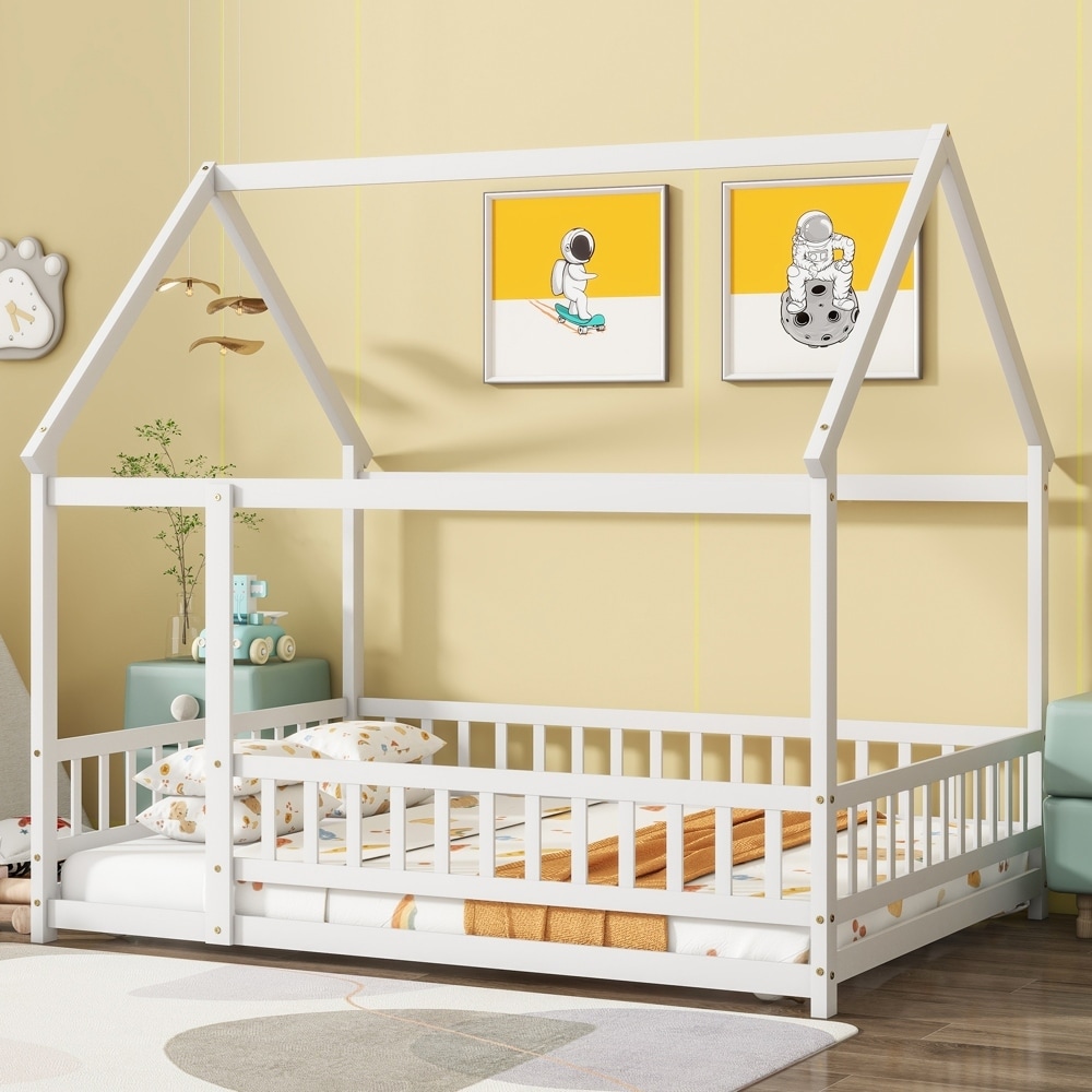 Full Size Wood House Bed with Roof and Fence for Kids