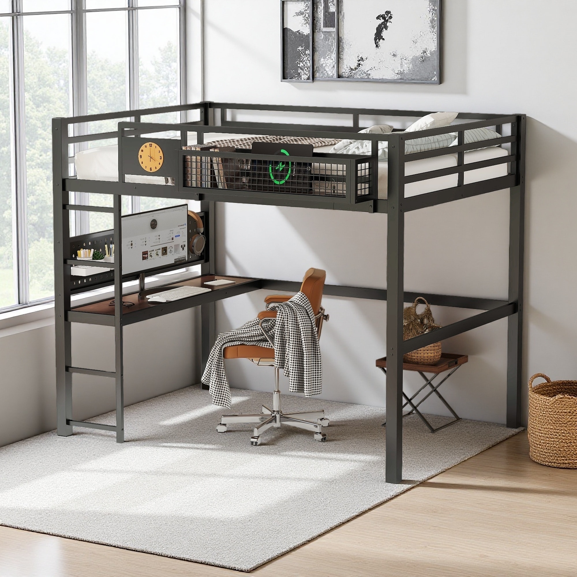 Full Size Metal Loft Bed Frame with Desk, Pegboard, Storage Basket & Charging Port - with Built-in Clock, Study Workstation