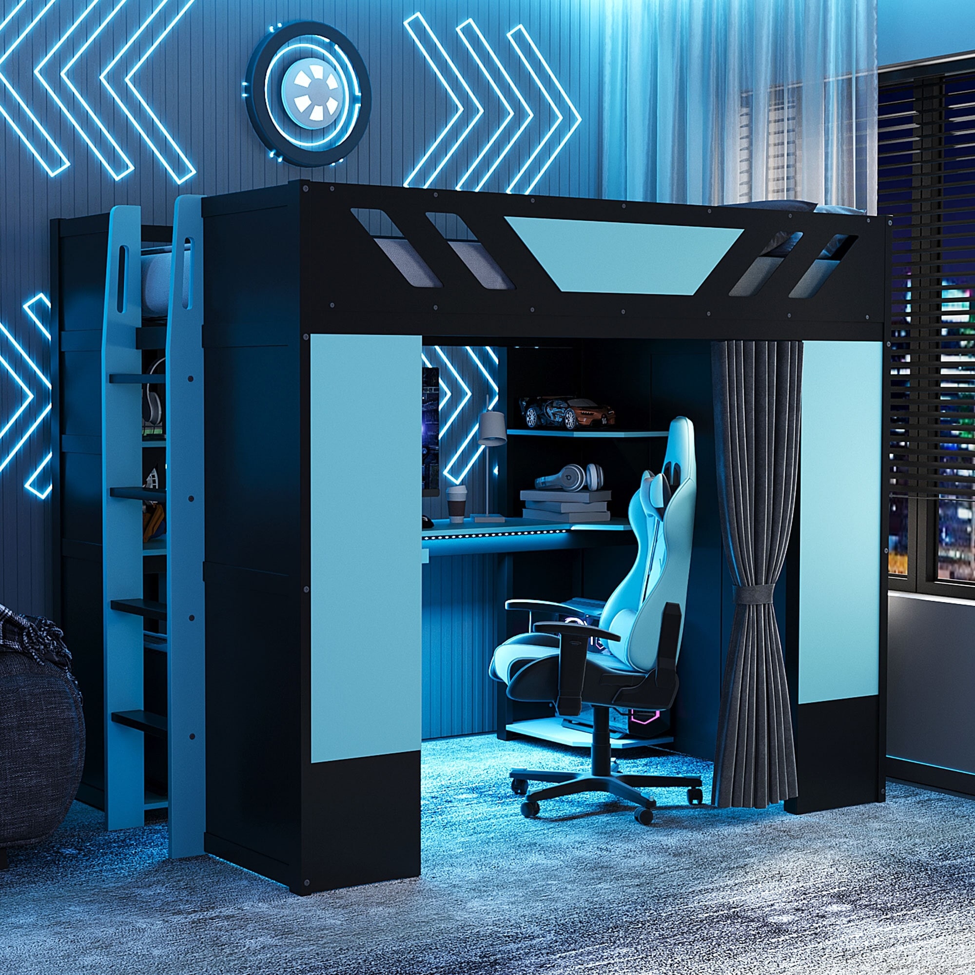 Wood Loft Bed with Blackout Curtains and RGB Lights,Full Size