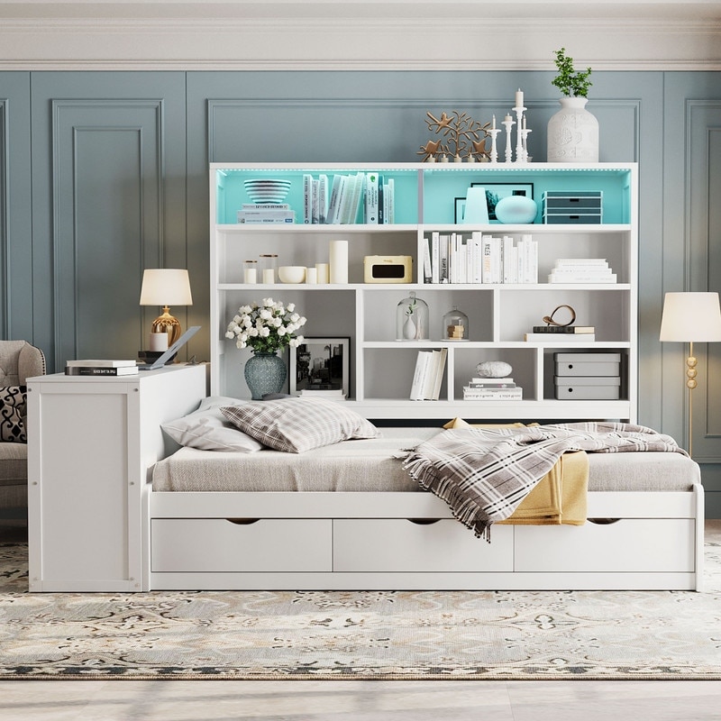 Full Size Wooden Daybed - 3 Drawers, Built-in Desk, Open Shelves & Dimmable Lights
